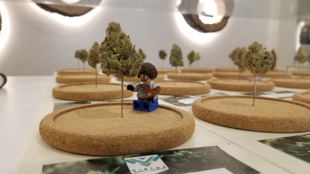 Many comments have been made about “happy little trees,” and then one customer noted how the case looked like a model train set. The staff decided to lean into it, perusing Lego sets until they found the ultimate tree-hugger: Bob Ross.