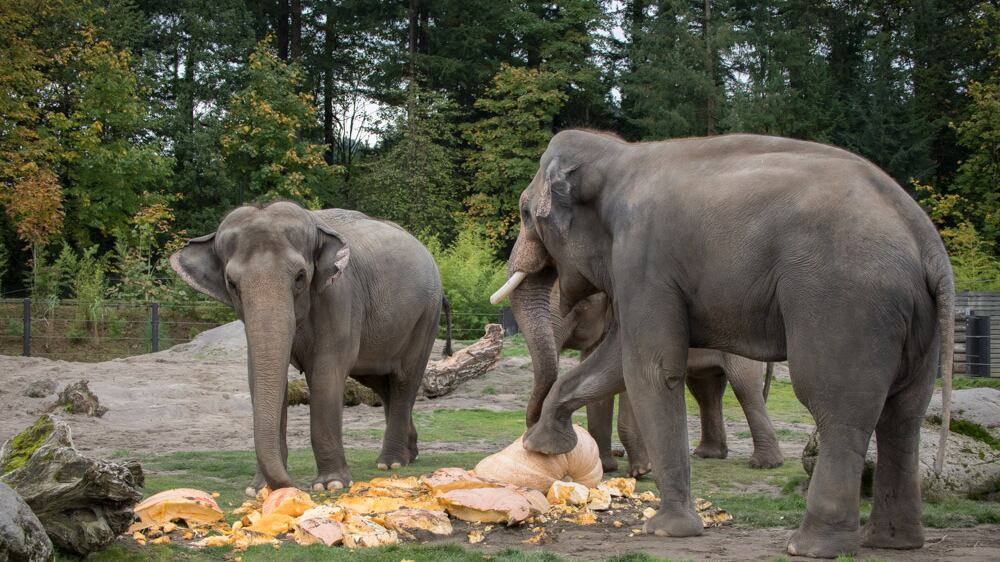 This morning, the elephants at the Oregon Zoo participated in the annual Squishing of the Squash, which is pretty much what it sounds like: Every year around Halloween, a few monstrous pumpkins are presented to the zoo's family of Asian elephants, whose natural inclination is to stomp them open and lap up the tasty innards.