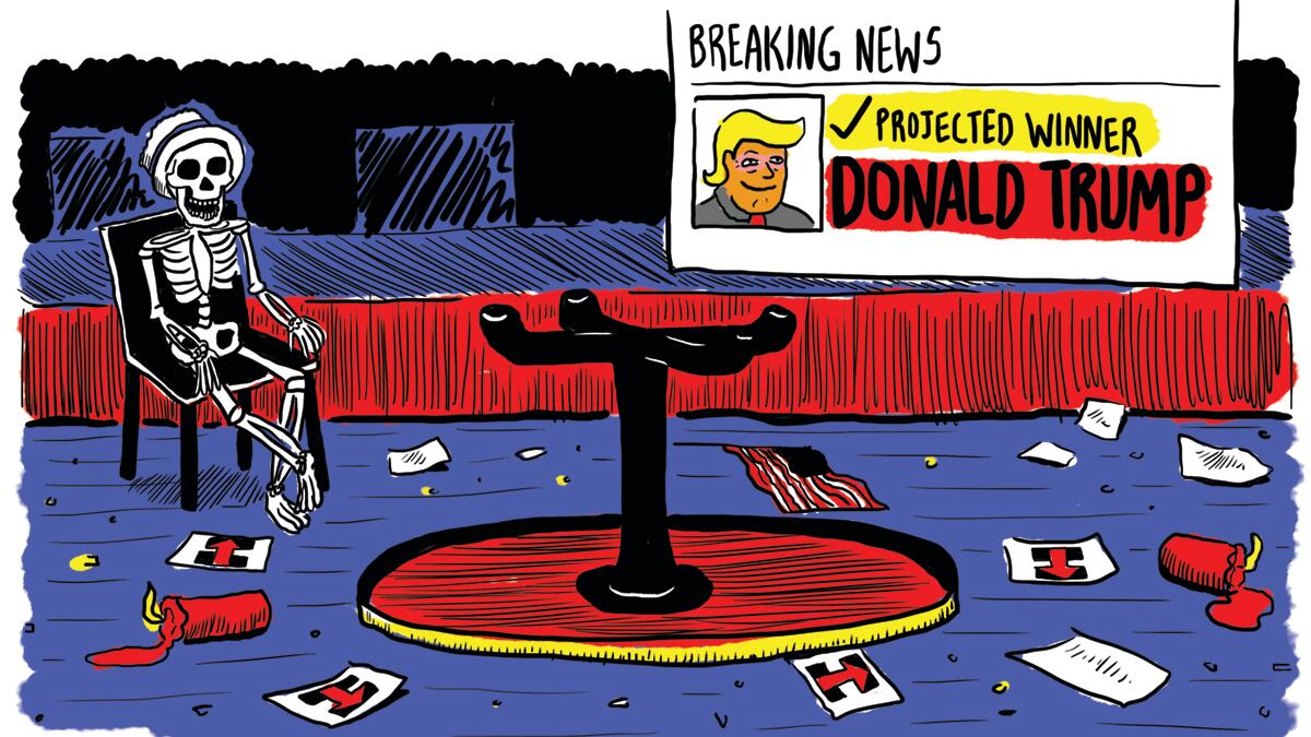 Schinderle: I remember everyone was like, "It's going to come down to Wisconsin," and being that's my home state, I was like, "You motherfucker." I distinctly remember people clearing out and admitting defeat, and I was holding onto this last string of hope. I was like, "There's no way. I'm from there, I know people from there. There's no way they believe in this guy. There's no fucking way." On the big screen, the Wisconsin numbers came in. It was just this state, huge on the screen, and it was red. And I was like, "Oh my God." I was speechless. I started crying to myself a little bit. It felt like a betrayal.