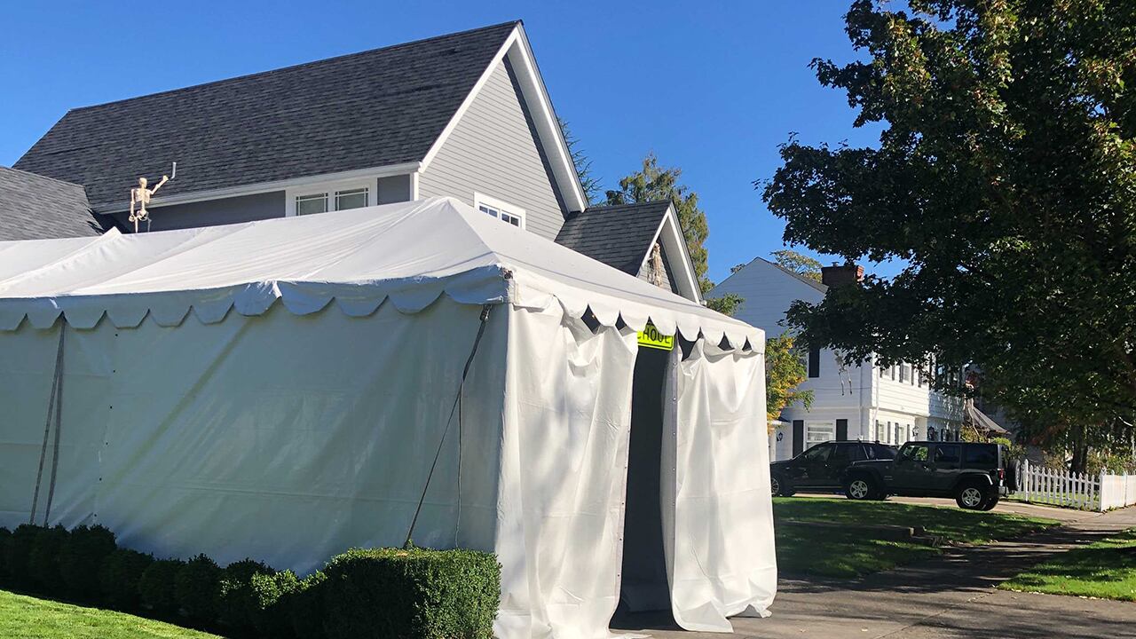 The tent extends from Morita's two-car garage all the way to the sidewalk. Desks are spaced 10 feet apart. Students have their temperature taken before they can enter and, of course, masks are required.