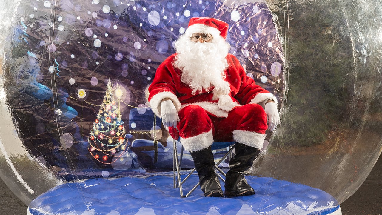 No, he means a literal plastic bubble—specifically, a 10-foot-tall, 10-foot-wide inflatable snow globe.