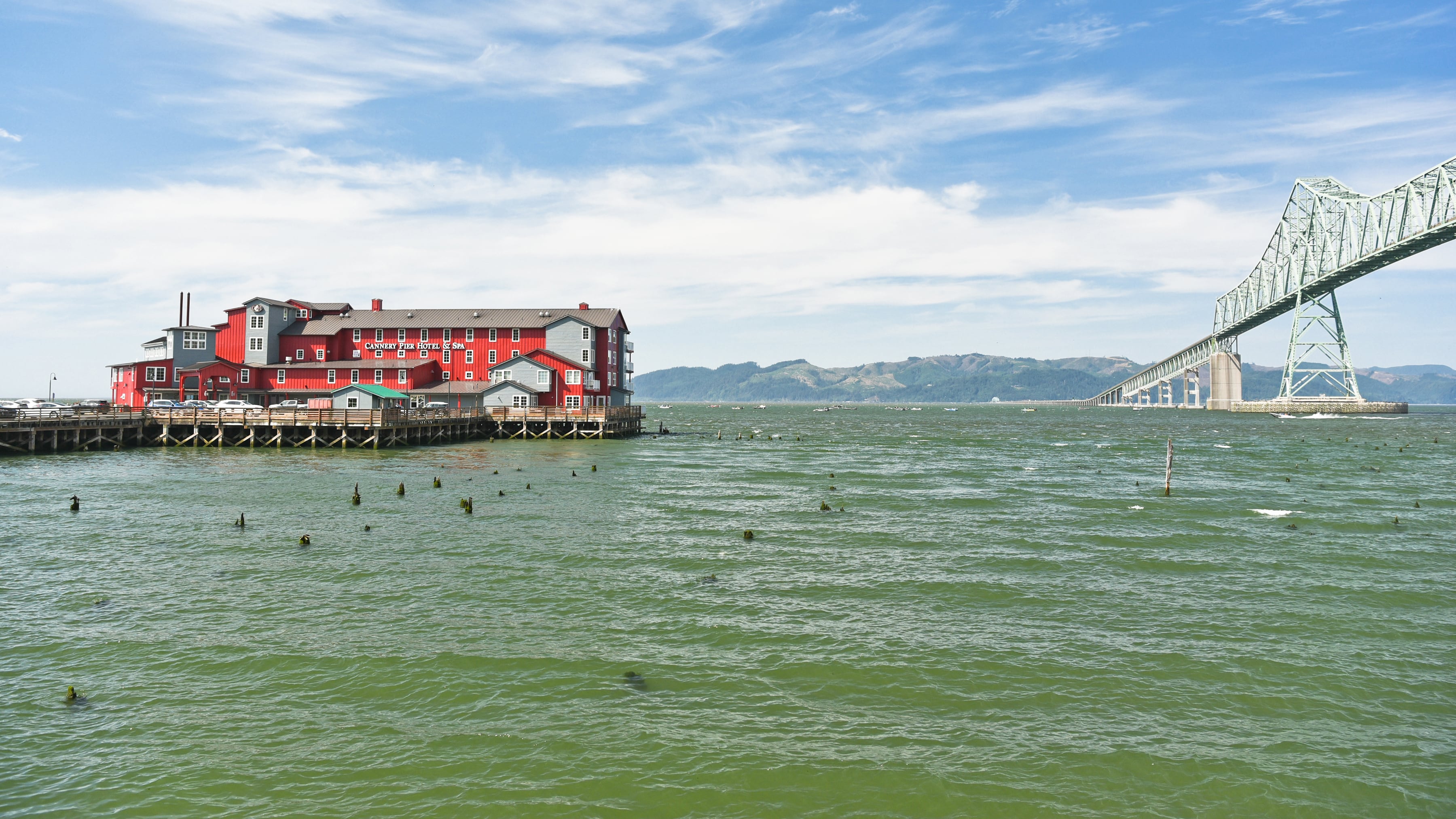 The hotel, which opened in 2005 on the former site of the Union Fishermen’s Cooperative Packing Company, was designed by Astoria native Robert “Jake” Jacob. His goal was to re-create the look of the canneries of yesteryear, with smokestacks, exposed steel beams and wooden trusses. The rooflines and window placements echo those of the old Union Fish cannery—the siding and materials are authentic to the period.
