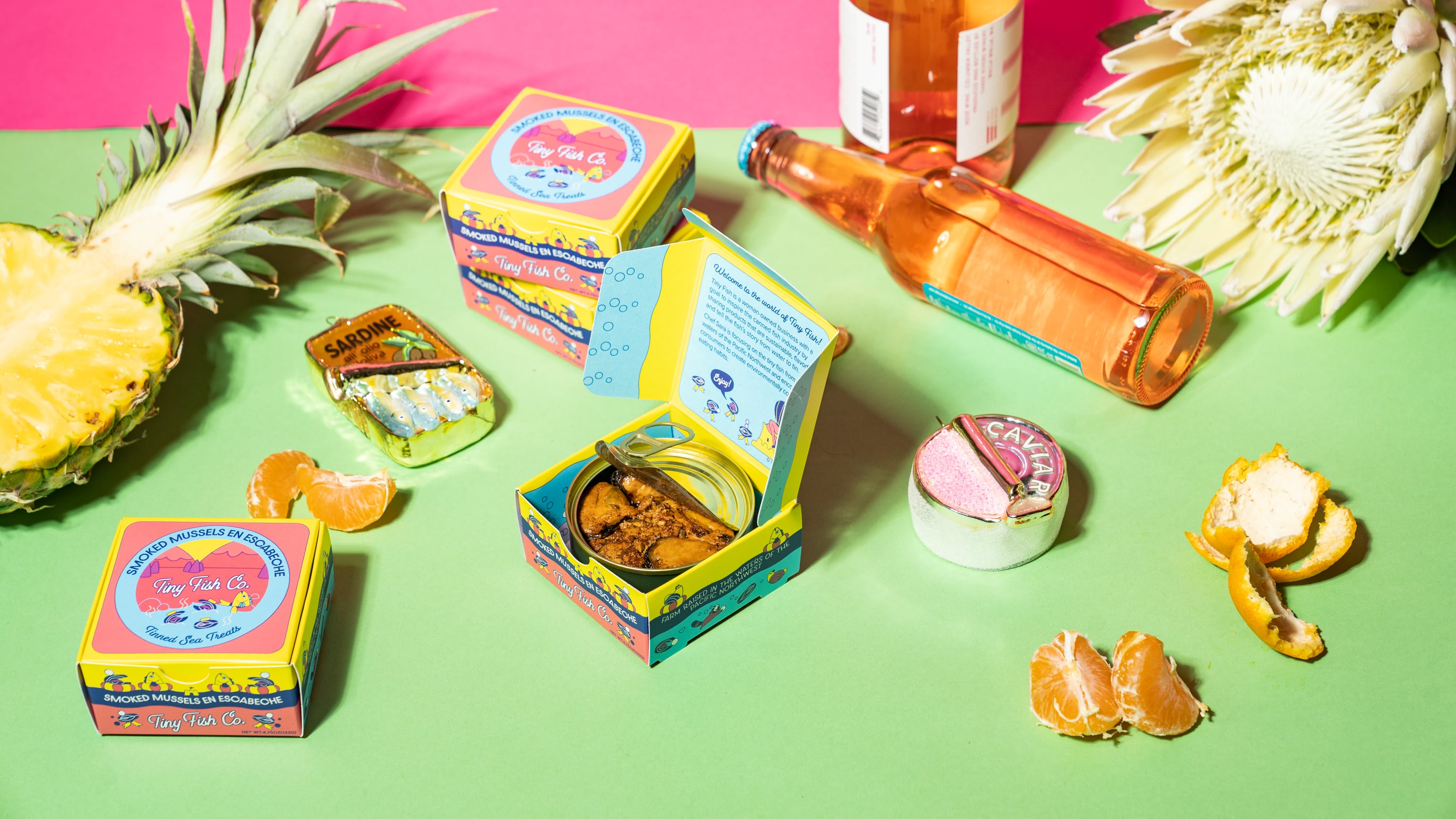 Boquerones, vinegar-pickled anchovies (“they turn anchovy haters into anchovy lovers”), were her original muse, but sourcing difficulties and a tedious production process steered her toward other underused sea life. Currently, Tiny Fish offers tinned rockfish, mussels, geoduck clams, and octopus—all pulled from the Pacific.