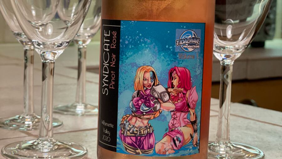 Last September, the Beaverton winery produced five custom Oregon wines featuring labels created by TidalWave Productions, a Portland comic book company. Each bottle of Syndicate’s chardonnay, pinot noir, syrah, pinot noir rosé, and pinot gris comes adorned with a drawing of The 10th Muse, TidalWave’s long-running superhero character, and a new superhero with powers and characteristics based on the wine itself. As described in the comic books that TidalWave publisher Darren G. Davis has developed alongside these labels, Sparkling Rose, for example, is “fizzy, sweet, and produces bubbles of power,” while Pinot Noir is “earthy and dry with a hint of menace.”