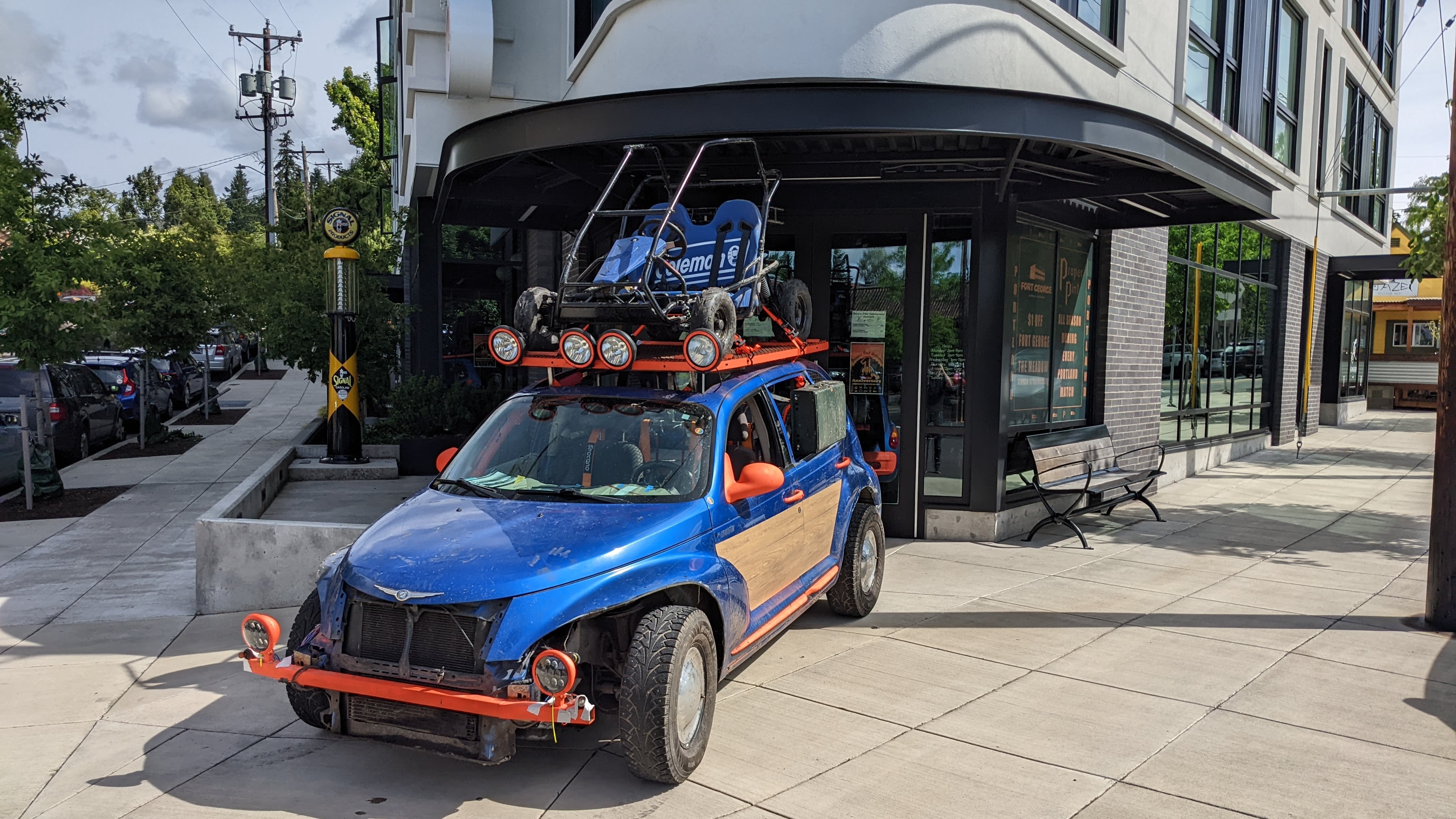 Hiatt’s rig, a 2004 Chrysler PT Cruiser outfitted with a draft system fashioned out of an old camp stove and go-kart roof rack named named Proper Pint Crusher, helped him and his team pick up about 500 pounds of garbage over 48 hours this past June.