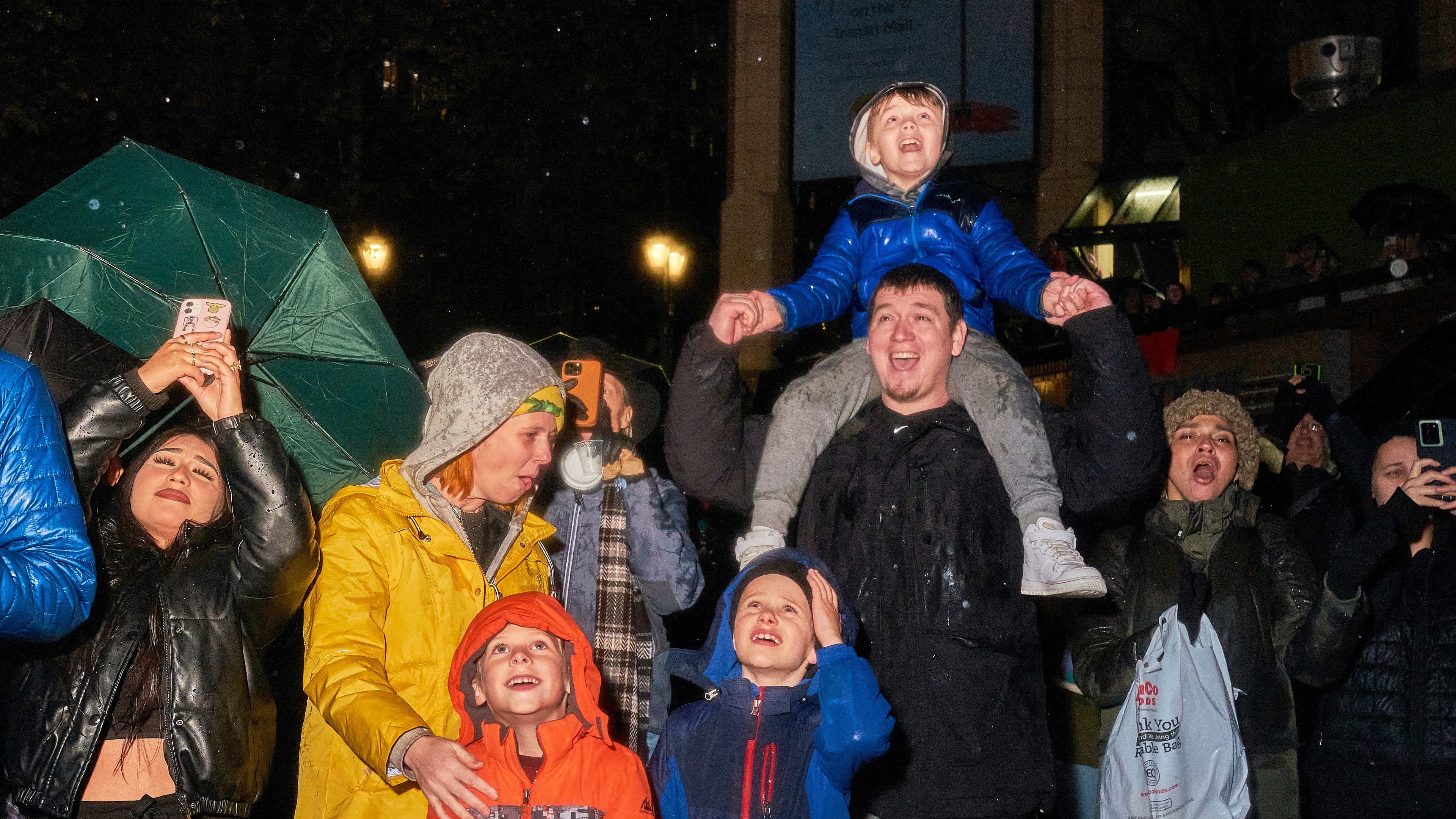 Despite downpours and chilly temperatures, the crowd stuck it out through a (perhaps too lengthy) sing-a-long led by Pink Martini’s Thomas Lauderdale before the 75-foot Doug fir’s 9,500 lights were switched on.