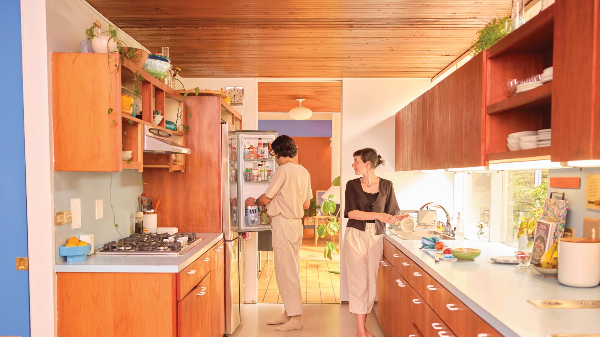 Morgan, a copywriter for Rejuvenation, and Berahimi, a graphic designer, had been living in Northeast, off Williams Avenue, and weren’t even looking to move, but they reconsidered when their friend sent them a link to a listing with a note: “Everything about this house—it’s so you guys.” So they joined the throngs of looky-loos who wanted to get a glimpse inside a home built in the heyday of Portland’s midcentury expansion and once lauded as “The Wedgwood Home of Tomorrow.” They headed out in the rain to check it out.