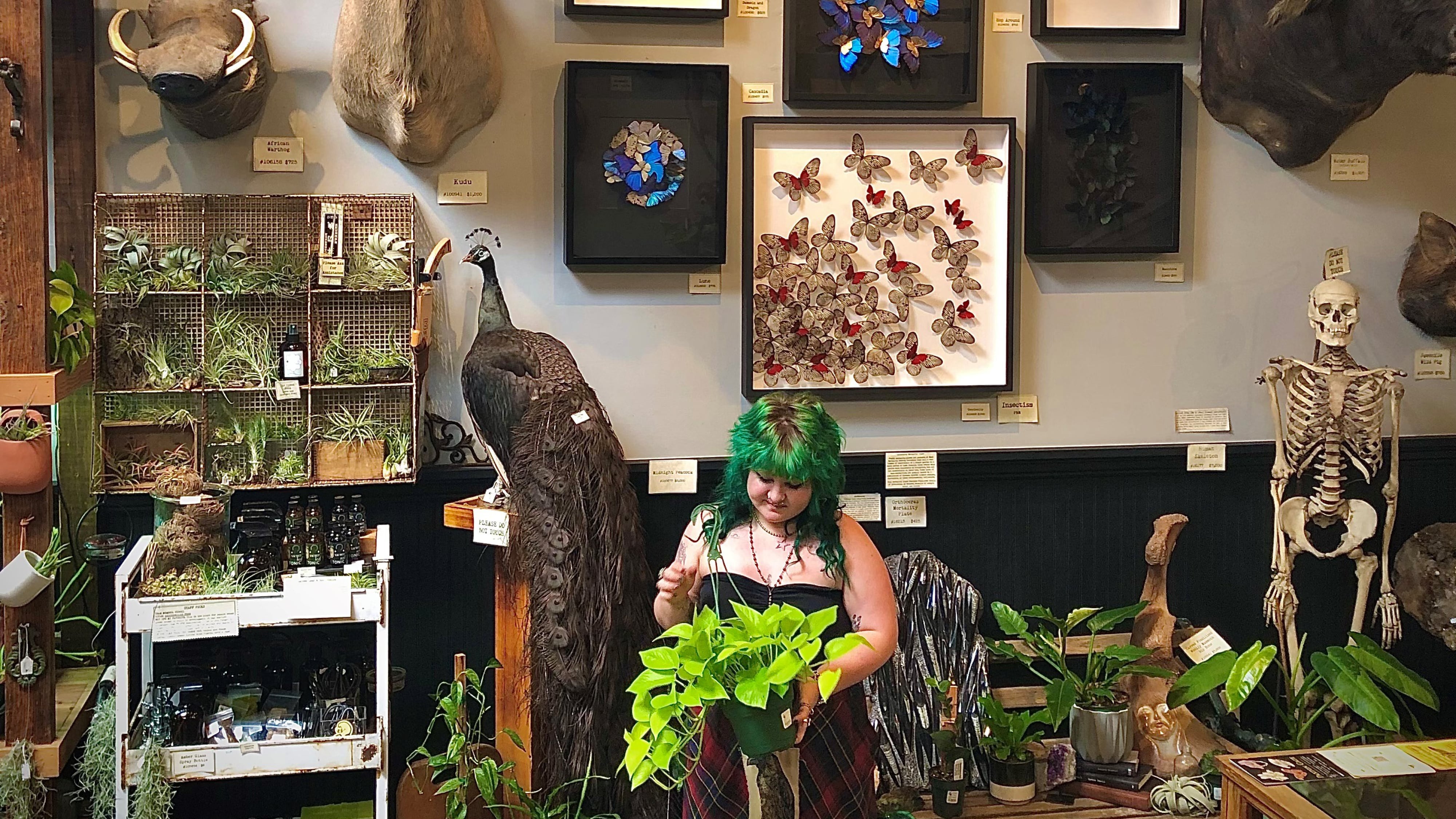 Dabble in the world of carnivorous plants and antique-inspired plant misters, or maybe snag something totally unexpected like ostrich leg lamps. Explore vintage mushroom posters, or dive into the stash of stationery, jewelry and T-shirts, and framed insects that scream personality.