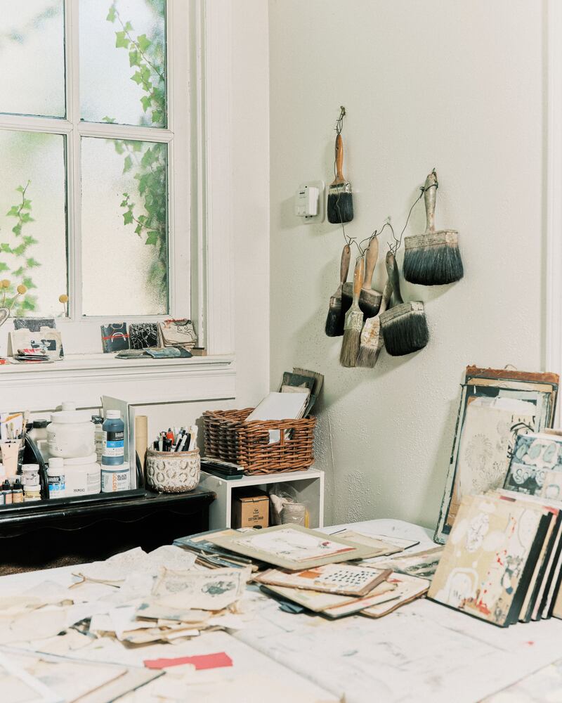The tall window frames have been painted shut, leaving the air in the apartment warm with summer’s glow, but it suits the space that feels brimming with creative life. In the corner of the living room is Avineri’s studio, a wide folding table stacked with her materials, including old passports with pages worn down to a velvety softness, sewn with other collected pieces, such as the lining of an old casket and found photographs. The entryway of her kitchen is haloed with found black-and-white photo portraits taken from books, mounted on the backs of old hardback covers. Avineri finds herself drawn to reviving these lost objects, “things that have a story, that are somehow not my stories, but relate to my stories,” she says.