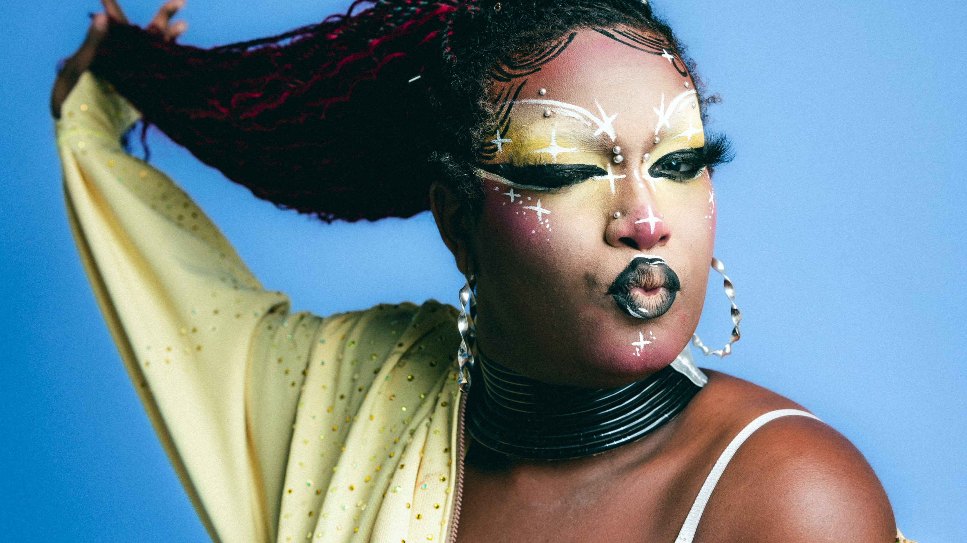 Barnes harnesses their illustration and painting skills for fine details in makeup and costumes. “I like to show off the costumes that I make and the hard work that I put into something that’s on my body,” they say. A corset hoodie paired with a matching miniskirt adorned with yellow safety pins, layered over a rhinestone cropped T-shirt and high-waisted underwear being a recent favorite costume of theirs.