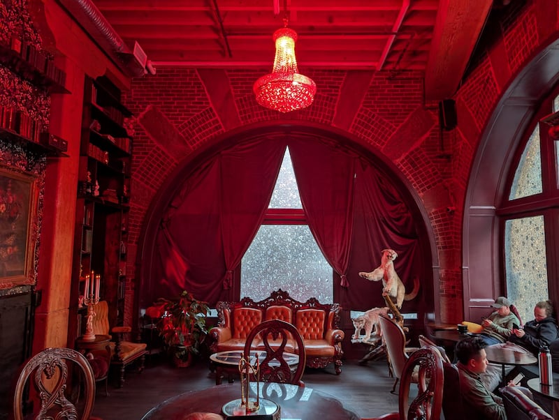 Slipping through a secret passage into a parallel business is honestly a fun enough experience, but Conspirators’ Coffee Lounge isn’t there for lookie-loos. Purchase is required, but after that, you can drink in the sights of an ornately decorated, respectfully quiet lounge that somehow really feels like an old mansion’s library or cigar lounge without veering into Disney knockoff territory (right down to an especially jacked-up-looking taxidermied wildcat by the east-facing, two-story arched window; very old money).