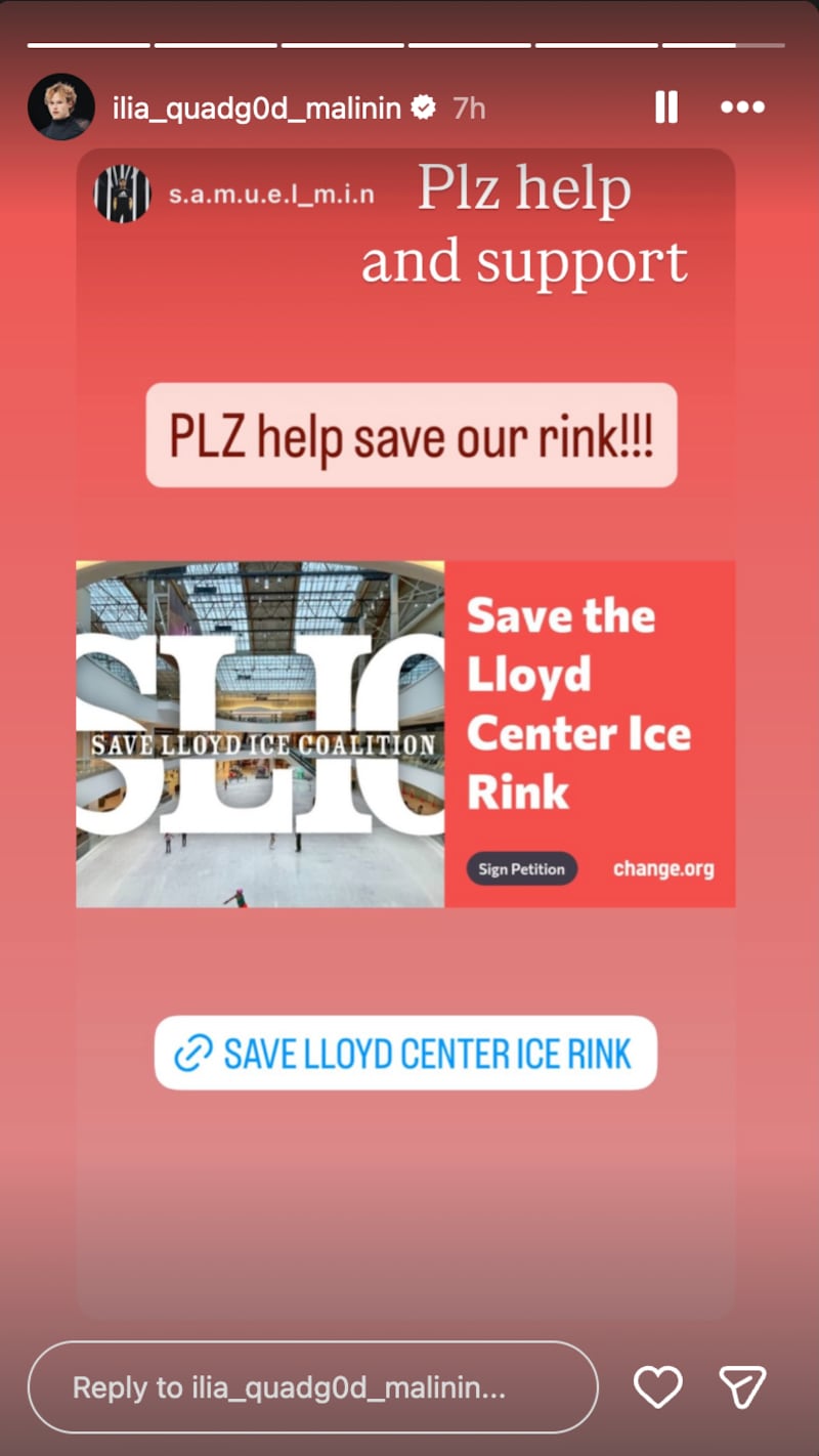 Figure skater Ilia “Quad God” Malinin just weighed in to oppose the forthcoming demolition of the Lloyd Center ice rink. On Feb. 10, Malinin posted an image to his Instagram stories that says “PLZ help save our rink!!” and a link to a Change.org petition called “Save the Lloyd Center Ice Rink.”