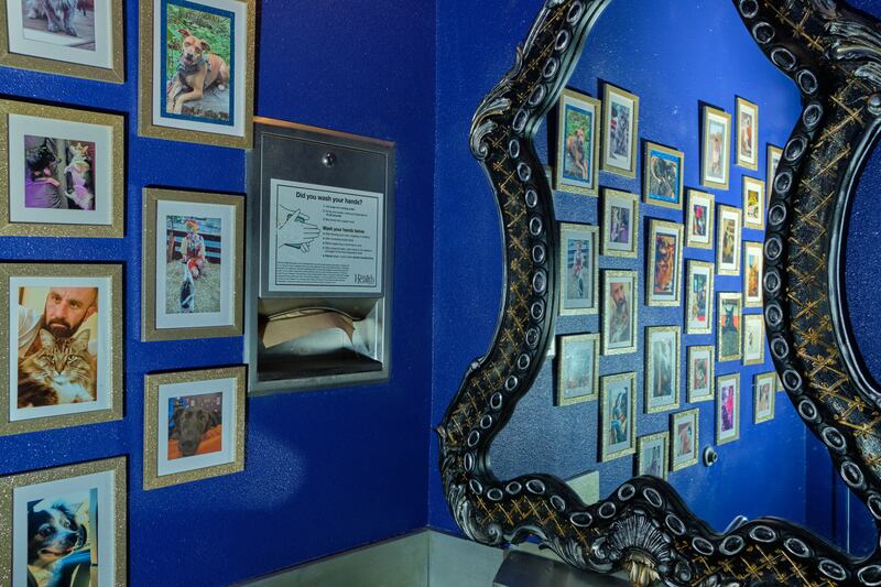 Eris Cocktail Lounge owner Tony Pepe devoted his bar, and his bathroom, to chaos. What he got instead was community. Or maybe just a clowder. “Eris is the goddess of chaos,” Pepe says, “and cats are the purest form of chaos in the world.” The first cat on the Eris bathroom wall was Schrodinger’s, courtesy of sci-fi author Robert Anton Wilson—part of a motley collection of nerd lore ranging from multiple Kyle McLachlans to a glowering painting of Vigo the Carpathian from Ghostbusters 2. The next two cat pictures belonged to Pepe and his closest friend. When the bar opened, Pepe asked in lieu of gifts for pictures of his friends’ cats as well. Each chaotic feline went up on the wall, each in its own sparkle frame. Customers started asking how they, too, could get their cats on the wall. And so the rule was born: Anyone who comes into the bar five times gets bathroom rights for their feline. “If you come in five days in a row and then never show up again, your cat will still be on the wall,” Pepe says. When the walls finally fill up, it’s not a problem. The cats will simply move to the ceiling.