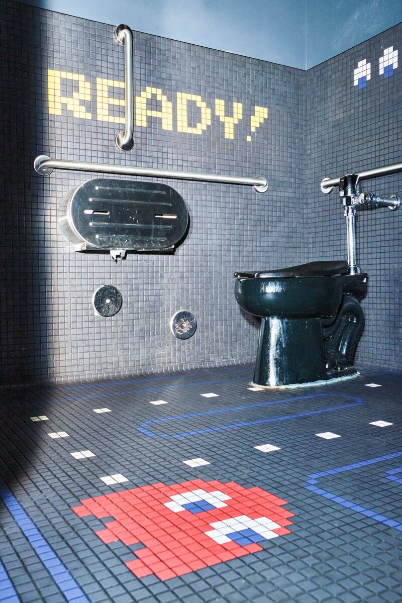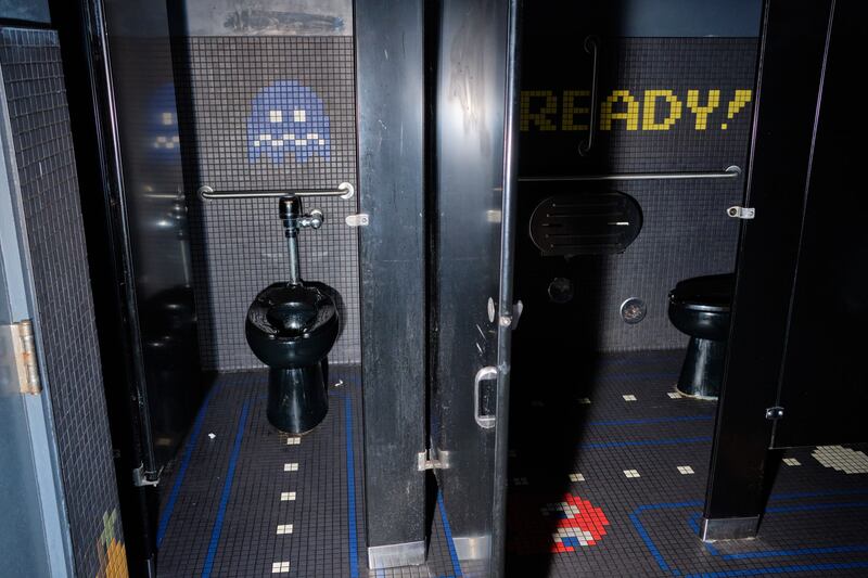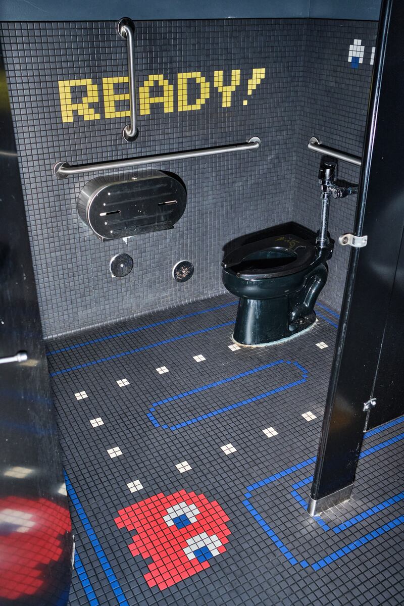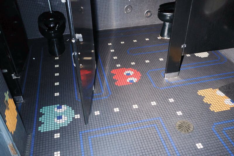 It turns out that the pixelated, early ’80s Pac-Man mazes translate perfectly to tile floors. The restrooms at Old Town barcade Ground Kontrol still wow customers 15 years after they were installed during a renovation, the manager says. Designed by Jessica Helgerson, the restroom floors are tiled as Pac-Man and Ms. Pac-Man mazes, with dots to eat and ghosts lurking. The walls say “1 up” and “2 up” above the urinals and “READY!” as per the beginning of the game.