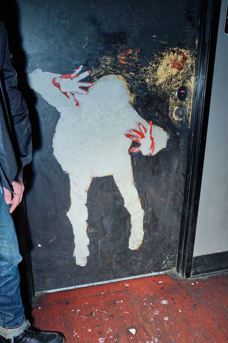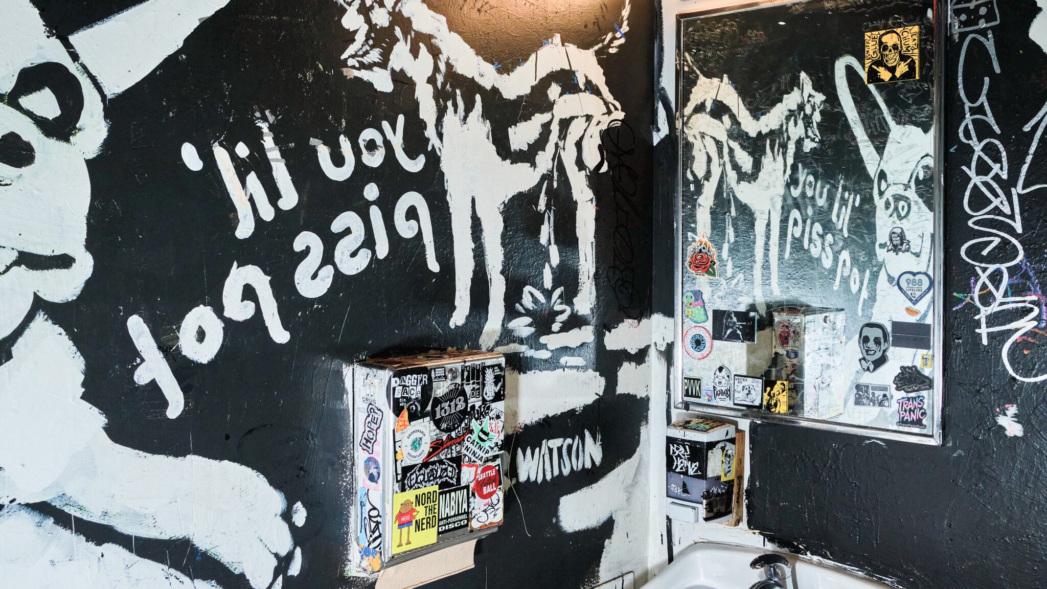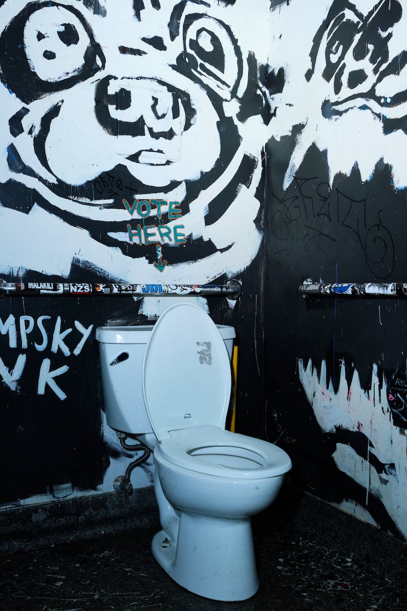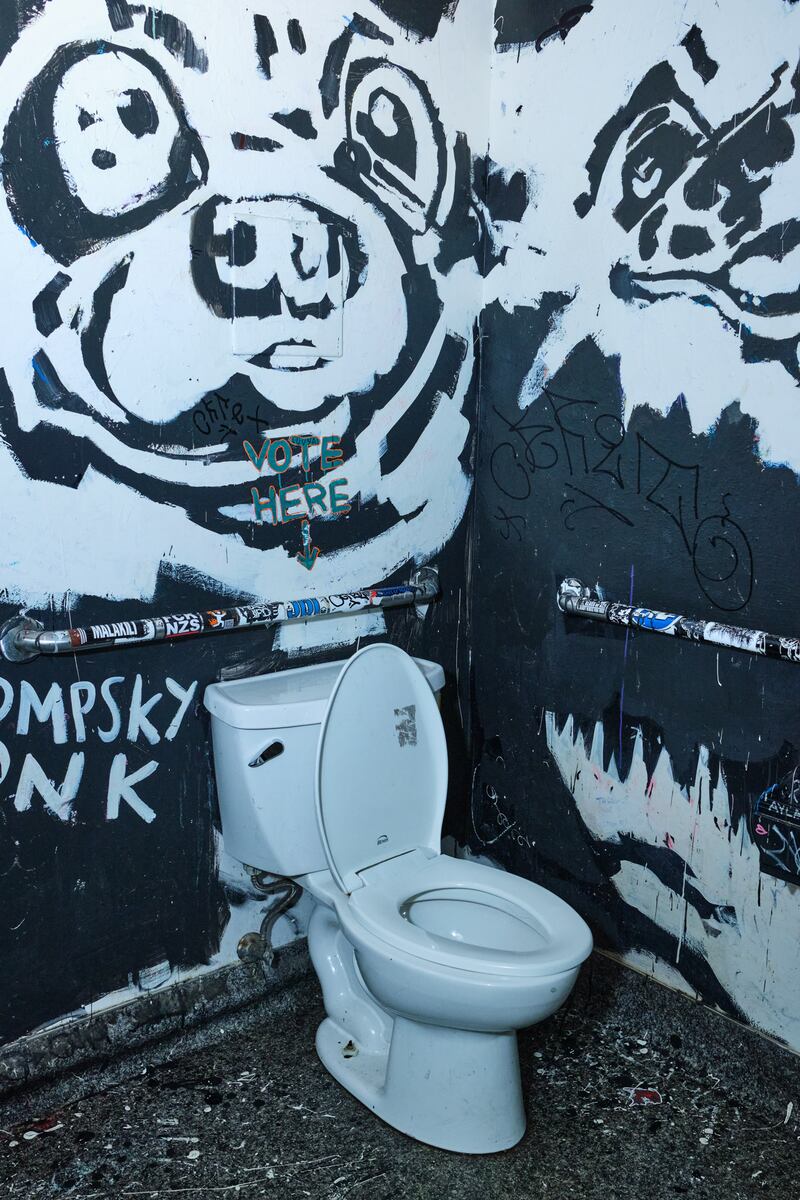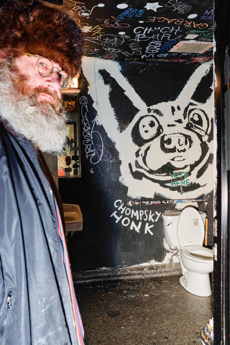 Bathroom graffiti in Portland is like the tide: It does not recede for long. Holding it at bay in the B-Side Tavern bathrooms is longtime bartender Gabriel Taylor, also a painter and a co-founder of Portland art collective PVVK Art Studio. One bathroom of the stalwart Portland rocker dive showcases spooky art by fellow PVVK artist Valentine Aveline, which Taylor regularly touches up against tags and off-color remarks. The other bathroom is much more personal. It is a museum of dogs owned and loved by Taylor, Aveline, and bar owner Tanya Frantzen. There is Doctor Watson, Aveline’s wire-haired terrier. There’s Frantzen’s Great Dane. And there’s Duchess Bigwig, Taylor’s chihuahua. And then there’s Chompsky Honk, Taylor’s much-missed dog whom co-worker Nina Rey describes as a “chonk of a chihuahua,” and his fierce Pomeranian sibling named Cheeseburger Machinegun. These last two passed on last year after a long life, with dates of death inscribed on the bar’s wall. And so each time that Taylor goes back into the bathroom to repaint and refresh their image, it is a labor of love. “When I go in there, it’s like, ‘Hey, cuties,’” Taylor says. “It makes me happy to go in there and see my buds.”