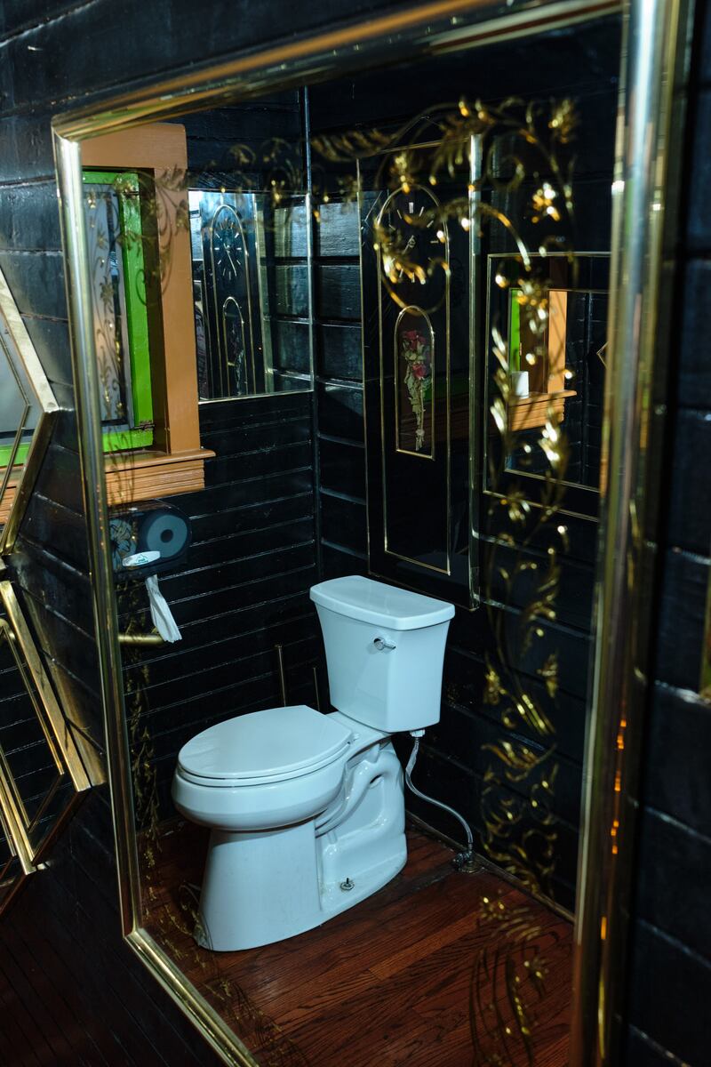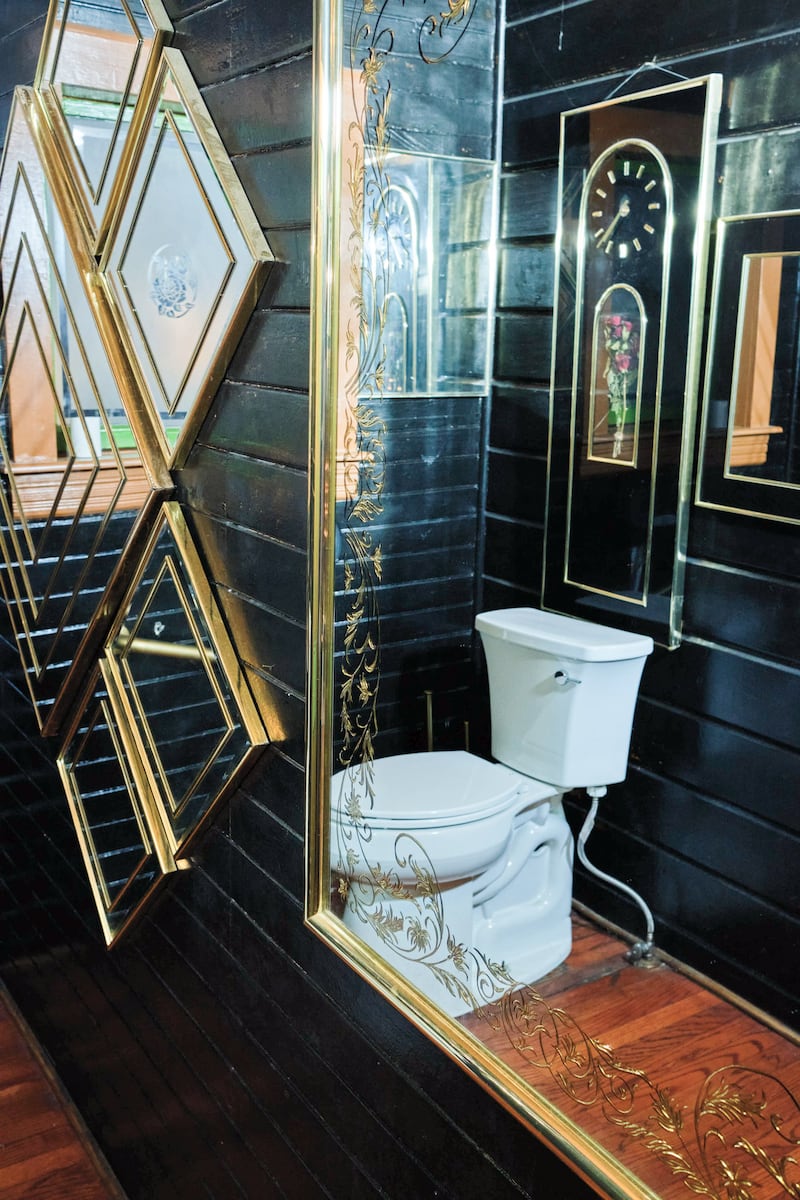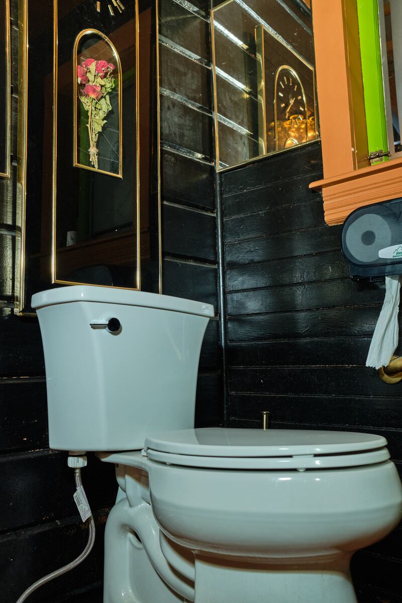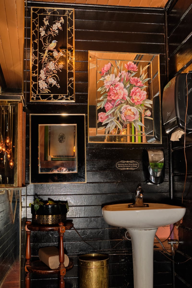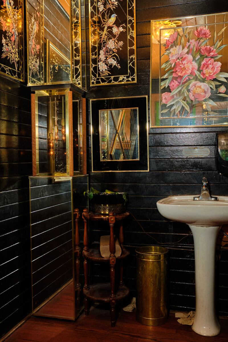 Portland can be a place of surprising domesticity. This extends to a distinct subgenre of its bars, which can feel as if you’ve stumbled into a family gathering where you’re inexplicably welcome. Cafe and cocktail bar Foxtrot, in the stately Queen Anne manor on Belmont, once home to the Pied Cow, is so aggressively domestic it almost comes out the other side and becomes uncanny. Its black-and-gold bathroom is also this way. “It started with just a collection of those kind of ’80s gold mirrors,” owner Britain Stephens says. It multiplied from there into a hall of etched glass. Deco flowers and birds. A double-stacked pedestal with a ceiling lamp in between. It’s like a grandmother’s vanity room, but amped to 11. “It’s just as if I was decorating my space, but maybe maximalizing,” Stephens says. He’s still not done. Ever since the place opened more than a year ago, he keeps adding and adding to its rooms. The bathroom, too, is unfinished: “It’ll kind of be an ongoing art project,” he says.