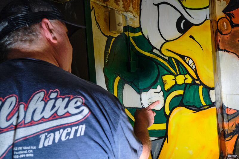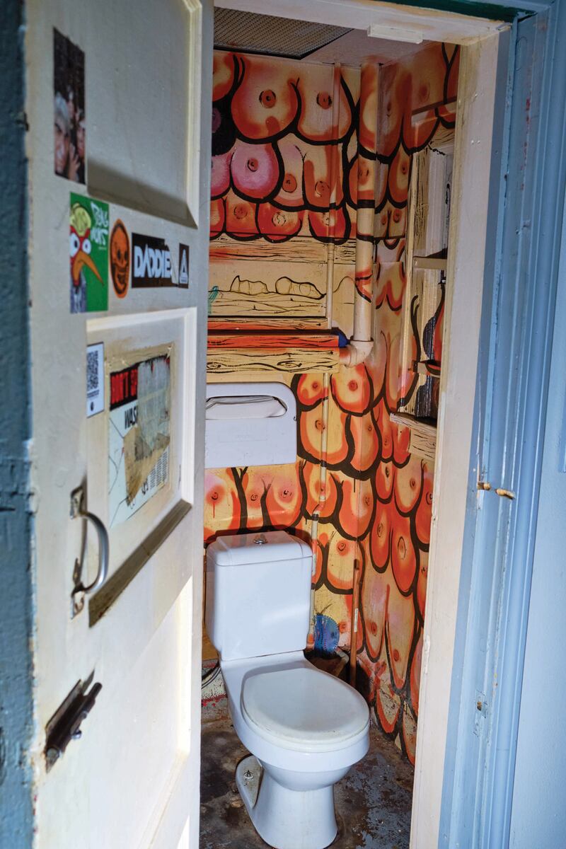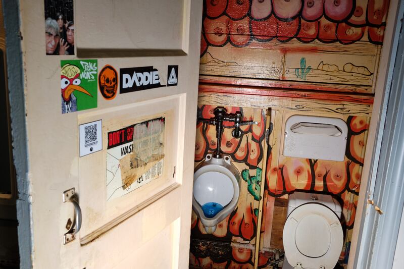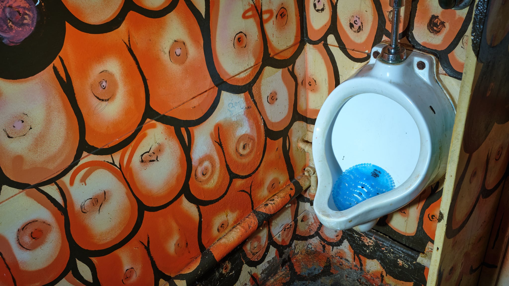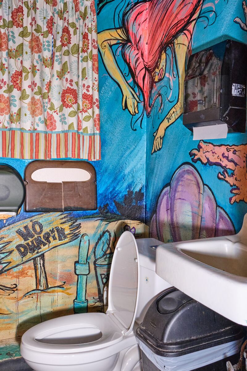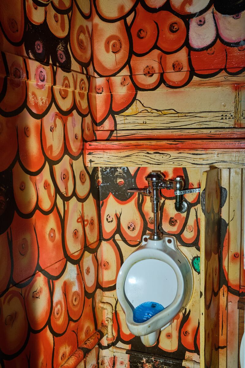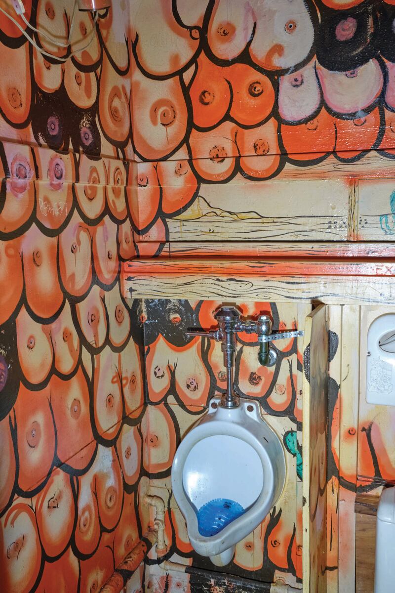 The men’s bathroom at the Wilshire Tavern is all about boobs. Enormous boobs, lopsided boobs, Black boobs, pink boobs, petite boobs—all boobs are celebrated on the hand-painted mammary mural at this Beaumont dive. Customer and local artist Faye Cuneo painted the bathrooms for the bar late at night, “whenever I was in the mood,” about 15 years ago, she says. She also jazzed up the women’s room with a mermaid theme. For the men’s room, Cuneo was inspired by the brown, tan and orange color palette of vintage cowboy wallpaper. But why boobs? “Boobs have a nice motion to draw,” she says. “I always had an idea of a repeat pattern of boobs like on wallpaper or fabric, and the men’s room seemed like an appropriate place to attempt that.”