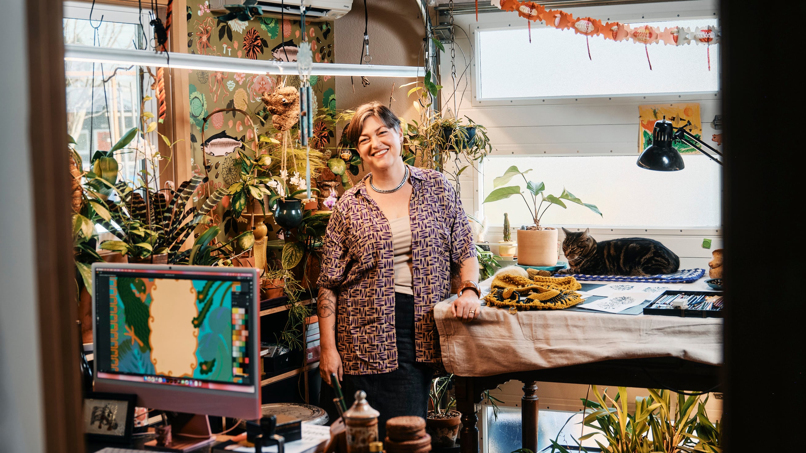 Blairstone begins her illustrations on tracing paper by hand; after inking them, she scans her drawings into her computer to color and process with design software. Her work is licensed through Portland interior design company Manolo Walls, which is produced through a manufacturer in the United Kingdom. Pitching clients, collecting references, and building mood boards are also regular parts of her work schedule.