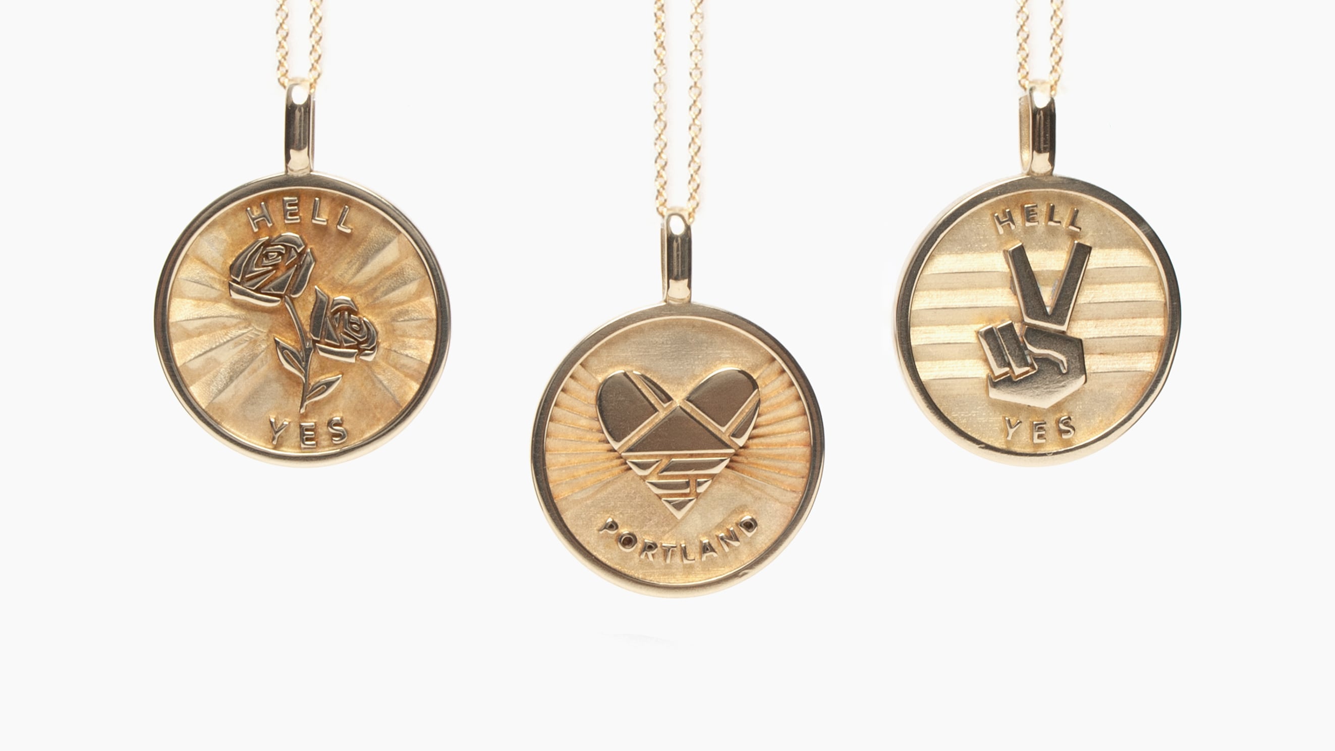 The “Hell Yes” medallions can be made of brass ($44), sterling silver ($94) or yellow gold ($1,490) and feature the words “Hell Yes” with a pair of roses or a peace sign (“half harmony, half see ya later,” is the apt description from Betsy & Iya.) The jeweler sold 229 medallions in the first week. The collection is also a fundraiser for four local nonprofit organizations and has raised about $1,400.