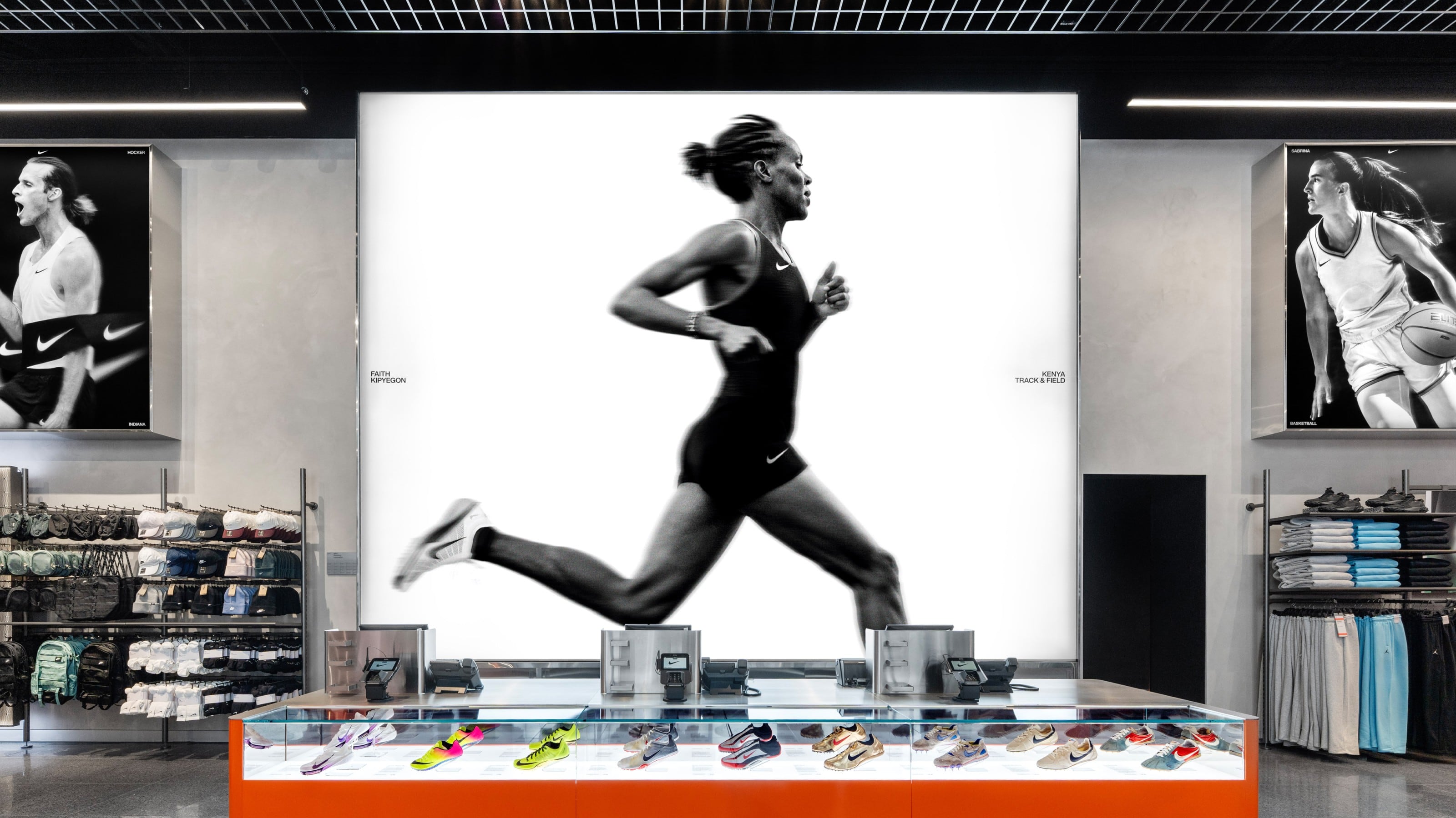 The 7,500 square-foot retail space features 18-foot ceilings that allow for enormous imagery of Nike athletes such as runners Eliud Kipchoge and Faith Kipyegon, and basketball players Caitlin Clark and Luka Doncic. The centerpiece of the store is dedicated to running footwear and flanked with huge images of Hayward Field at University of Oregon and the track at Nike headquarters in Beaverton, formally called Philip H. Knight Campus (PHK for short) as of last month.