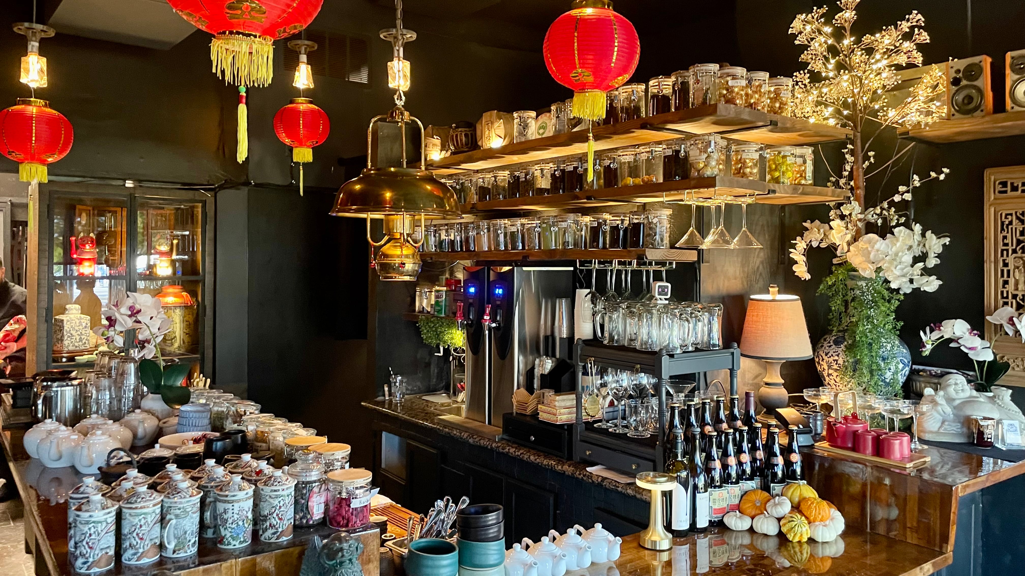 Now, the building has been revived as a teahouse—and a gorgeous one at that. Black banquettes and inky walls allow the red accents, like hanging paper lanterns and a floral painting, to pop. The bar is adorned with a fleet of teapots and etched mugs with lids—though likely placed there for convenience they’re just as pretty to look at as the orchid arrangements. Shelves behind the counter are filled with dozens of jars containing tea leaves: green, black, oolong and pu-erh. During our recent visit, we were told that even more varieties were on their way.