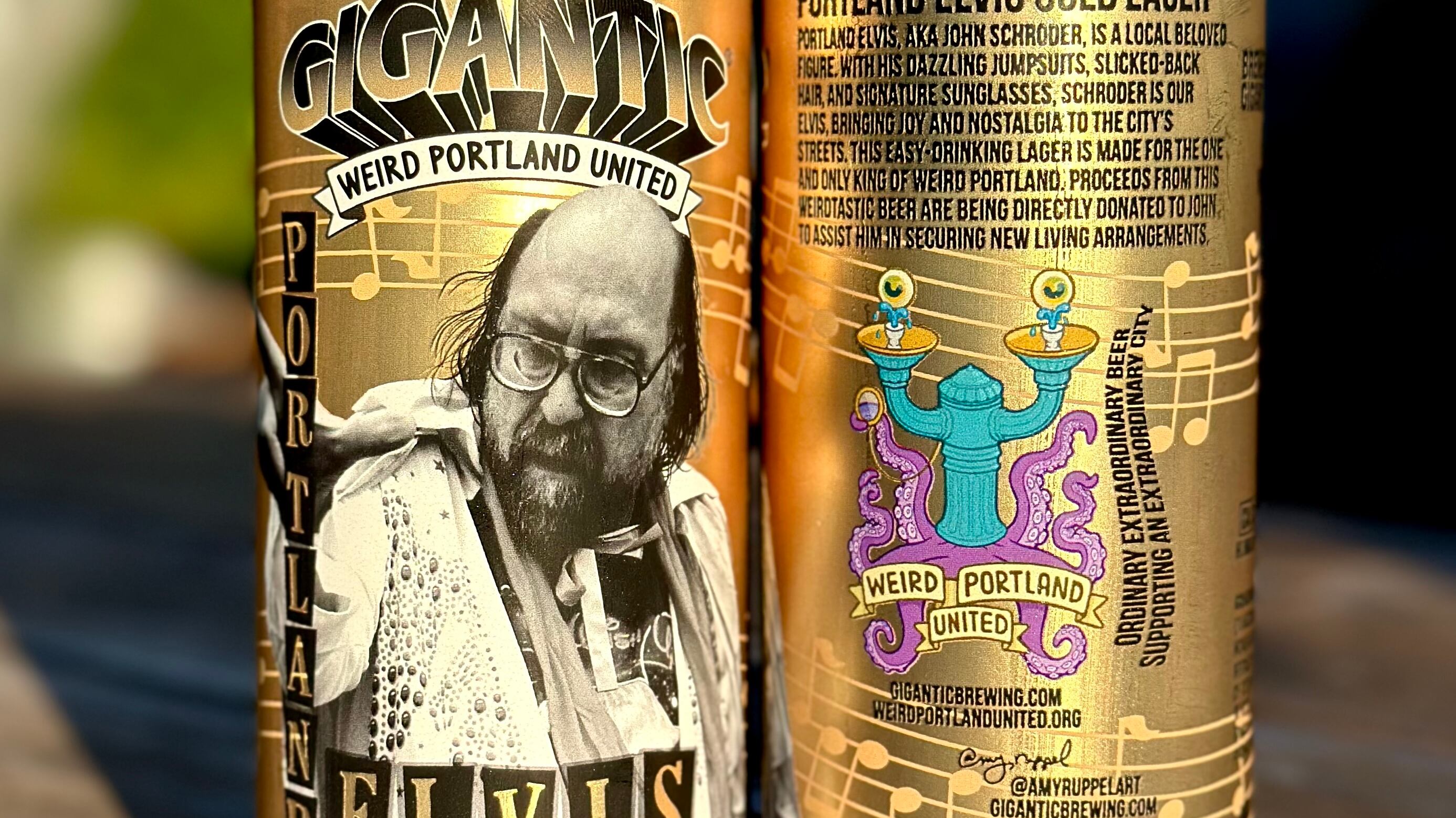 Portland’s longtime Elvis impersonator (42 years and counting) collaborated with the Southeast Portland brewery to come up with the Portland Elvis Gold Lager, an easy-drinker served in a bright gold can with Schroder’s picture on the front.