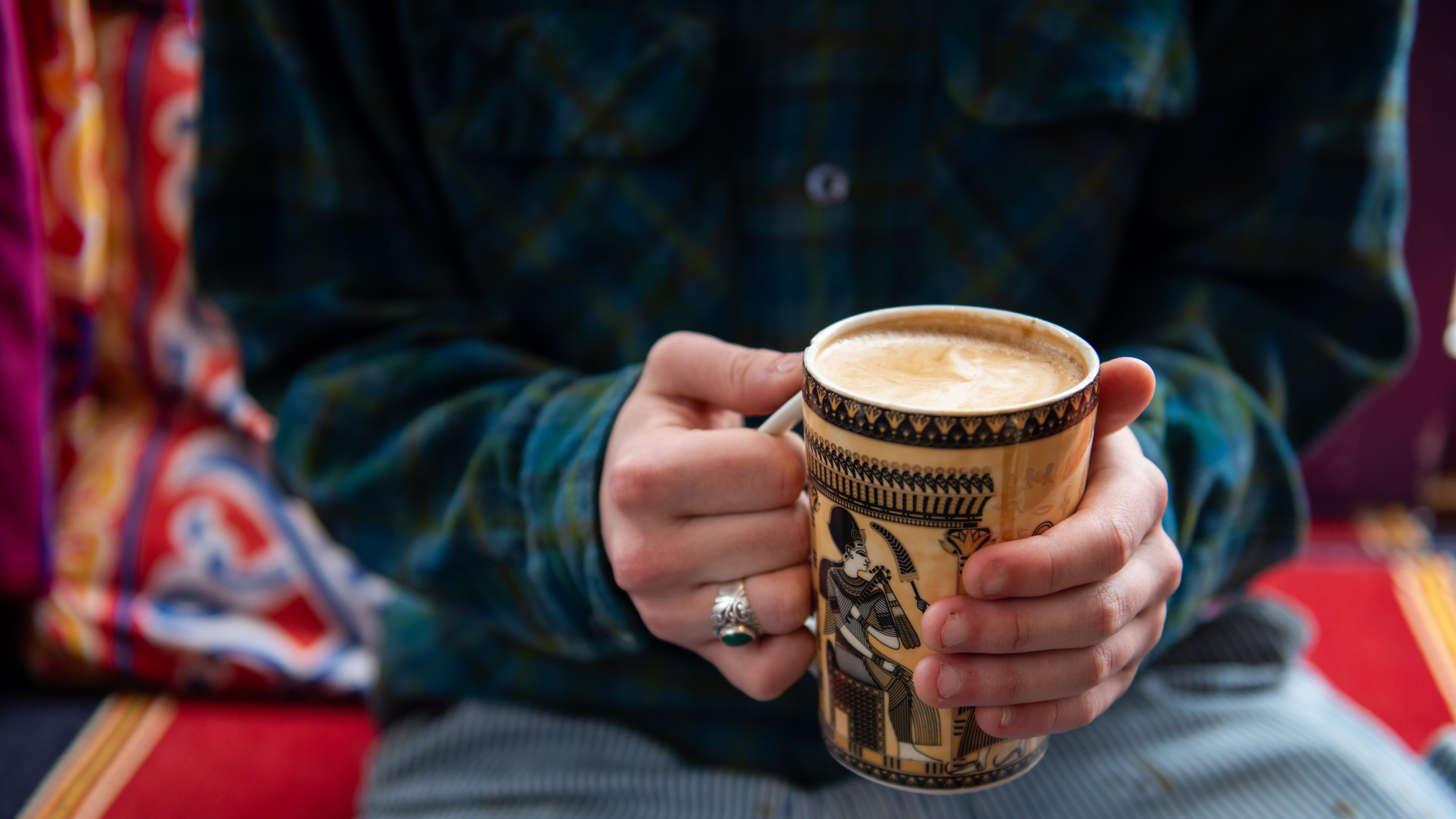 Nazir moved into a former Starbucks location in 2023 after outgrowing his bus. Tōv’s walls are now a deep regal purple trimmed with gold paint. Instead of plain, boring tables and barstools, Tōv’s furniture looks like a showroom for the neighboring Gold Door’s global fine art. Geometrically elegant and ornate wood chairs are set around gold plate tables, while rich red windowsill pillowtop benches allow for sun soaking. Anyone who prefers floor seating is welcome to use the conversational pillow nooks for a dining experience even further removed from Western customs. Modern-classical Egyptian folk and pop music recordings play regularly, and on days that myrrh incense sticks aren’t burning, Tōv’s air is perfumed by ground Rwandan coffee and earthy-sweet spices like cinnamon.