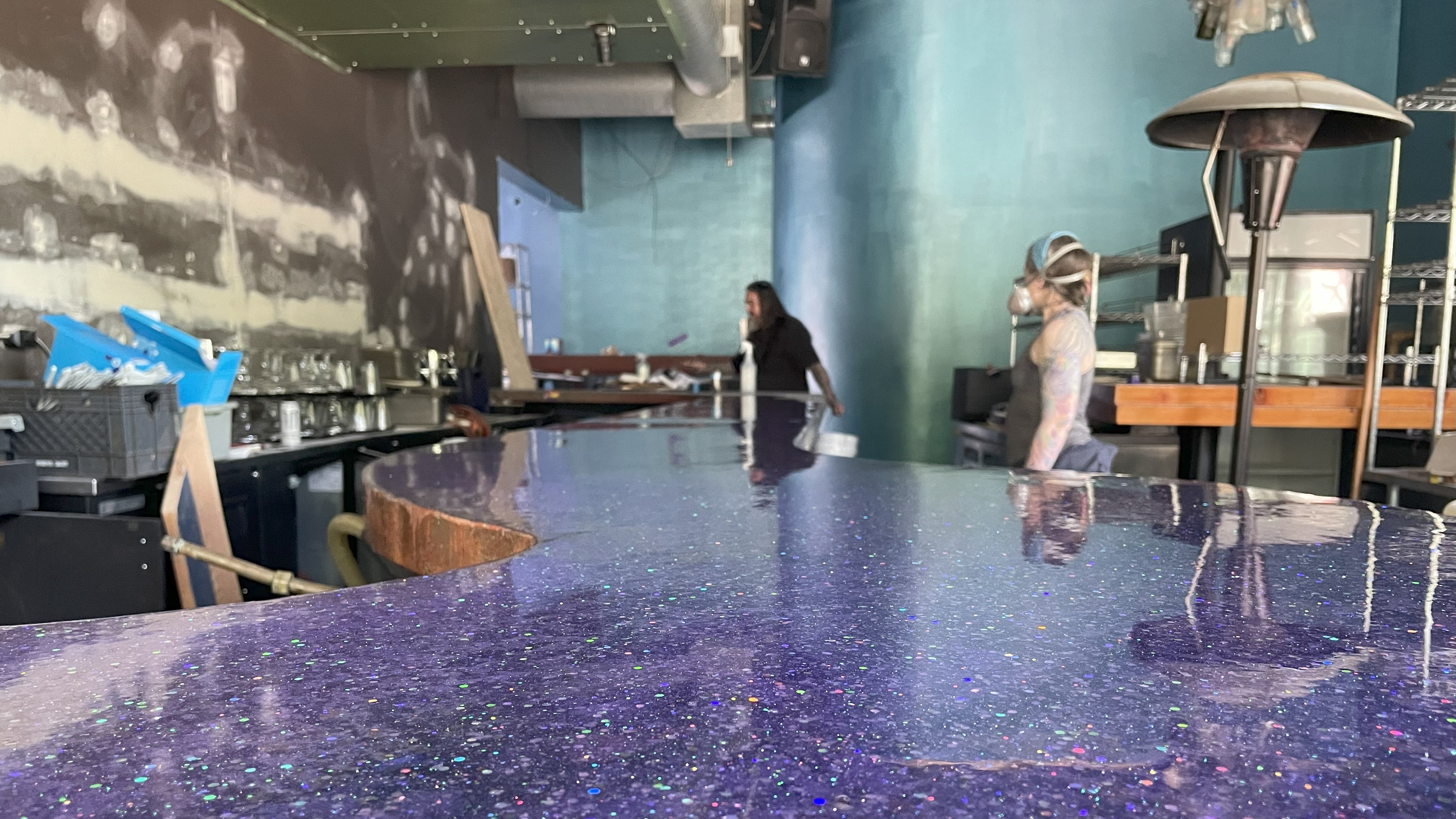 McNamara is updating Crush’s Y2K Tuscan color scheme to peacock-hue blue-green with gold accents, and she’s decorating with hot pink-framed mirrors and a planned mural of a peacock and phoenix in harmony. The build-out will remove a side office space to add a second bar (which McNamara has poured purple glitter epoxy over) to speed up service on show nights.