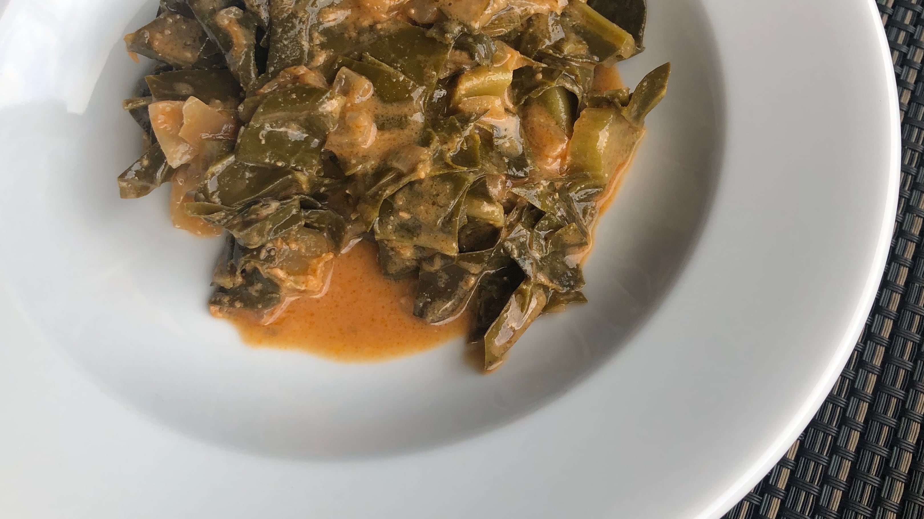 For those of us accustomed to eating peanut butter slathered on bread with jelly, the notion of adding it to vegetables takes a little getting used to. But your first bite of these greens will make you a believer. That peanut-forward taste we know from those lunchbox sandwiches gets subsumed under the earthy collards, oniony sweetness, and the subtle kick of jalapeño and ginger to provide a savory, creamy, and slightly elusive flavor.