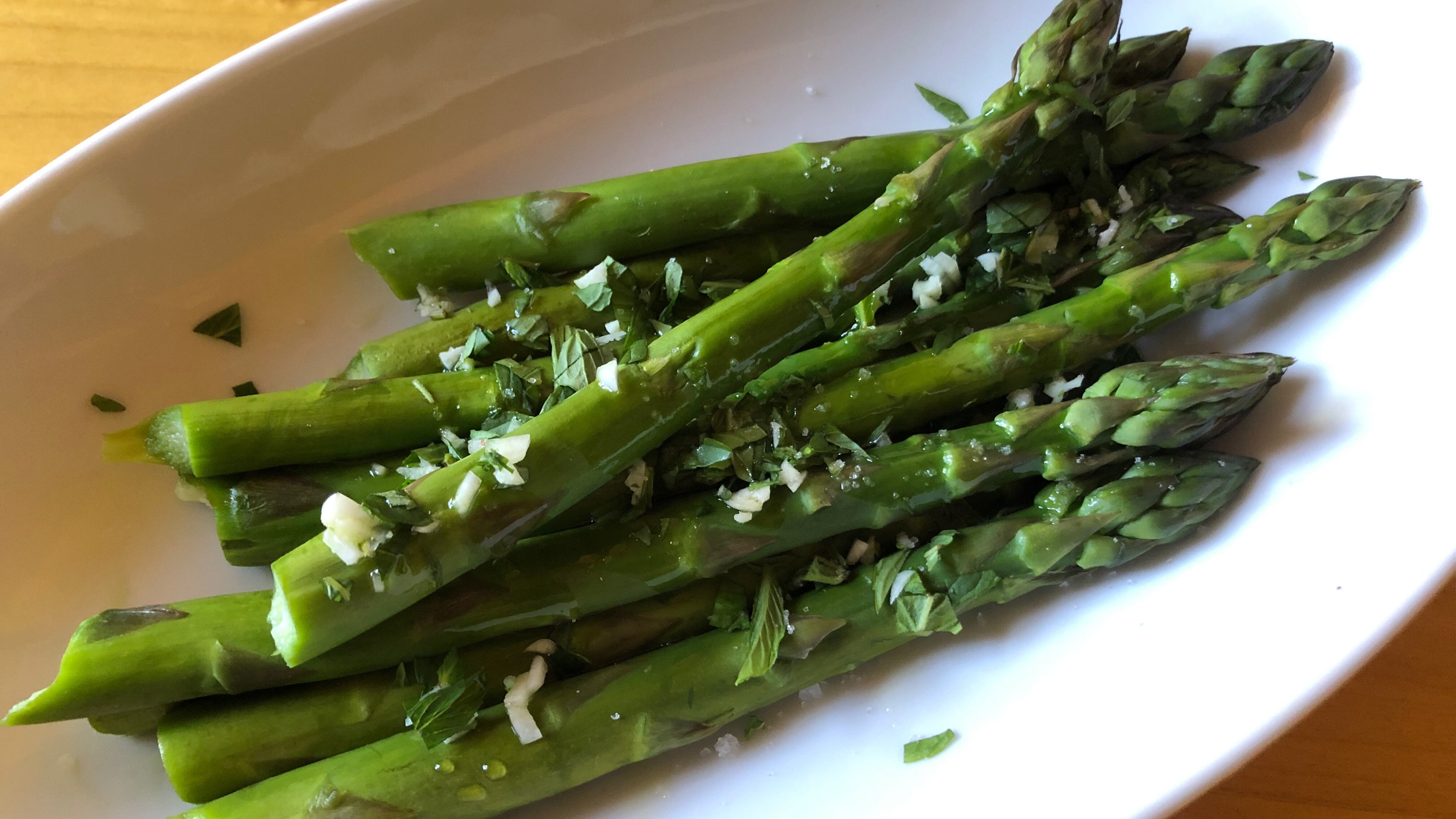 Since mint grows like a weed around here and starts popping up around the same time that local asparagus hits the produce section, it’s what I like to put on my early-season stalks. It also spreads quickly and can take over the garden, so I grow some in a pot in order to have a ready supply at hand.