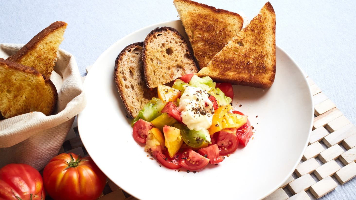 Grill the bread in olive oil until nicely browned, or toast the bread to your liking. Arrange on a plate and drizzle with olive oil. Cut the tomatoes into bite-sized pieces, put them in a bowl, add the mayo and a good drizzle of olive oil, and sprinkle with flaky salt. Toss gently. Take a bite of tomatoes followed by a bite of bread. Repeat as needed.