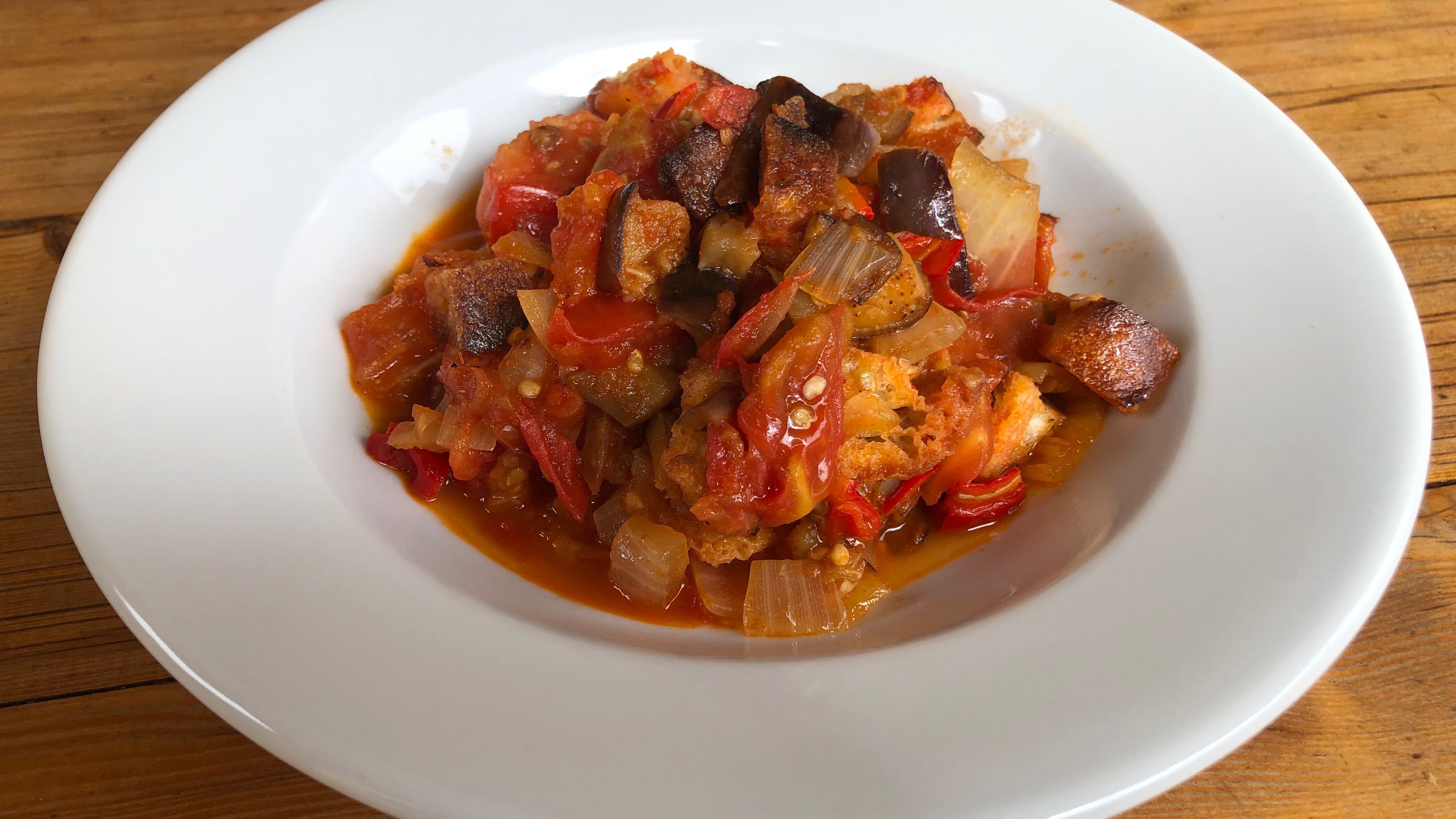 Add the onion and chiles to the eggplant along with a healthy pinch of salt, reduce the heat to medium, and cook for another 10-15 minutes or so until the vegetables soften and begin to brown. Add the tomatoes and cook until they collapse, maybe another 10 minutes. Add the reserved bread and pimentón and stir to combine. Add the vinegar, stir well, and remove from the heat. Serve warm.