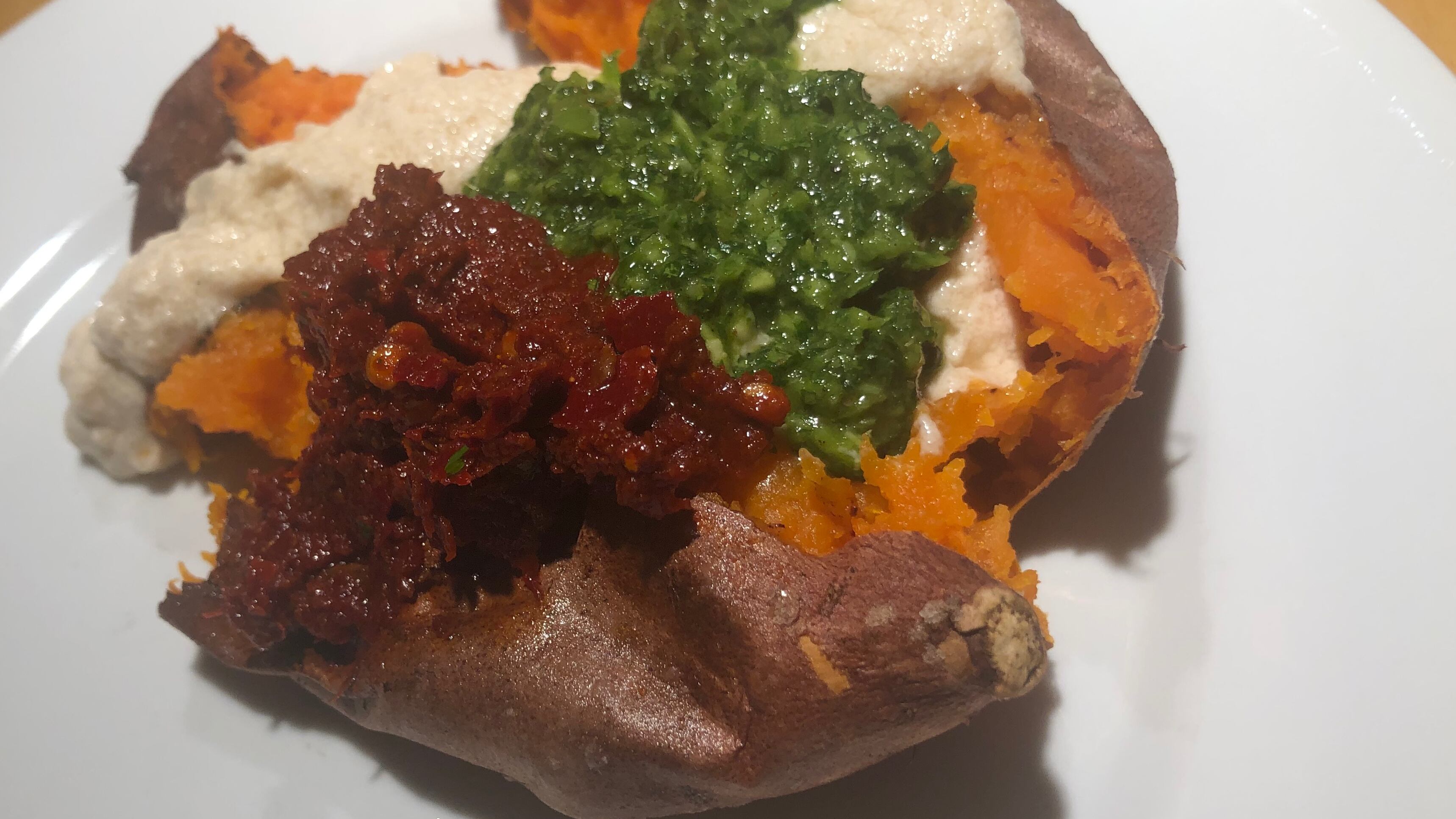To serve, lightly smash each sweet potato to split the skin. Spoon some of each sauce over the top.