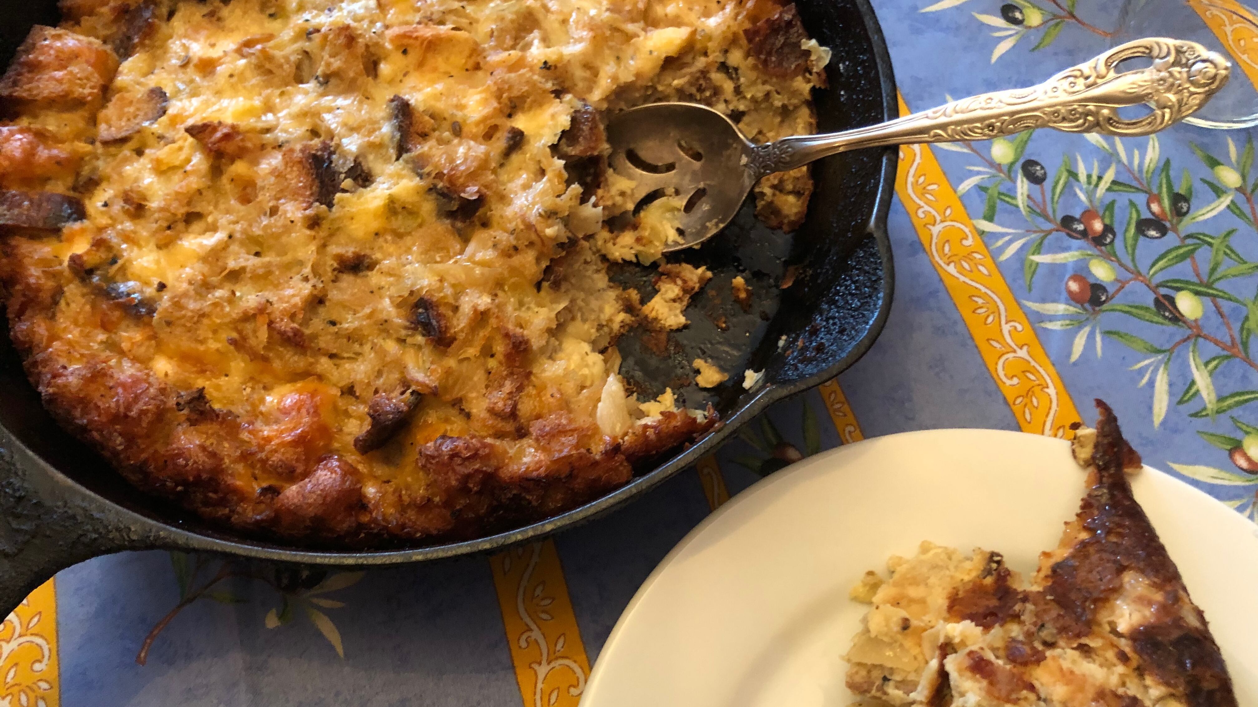 Drizzle a little more olive oil into a heavy 10-inch skillet or comparably sized baking dish. Add the bread mixture, spreading it into an even layer. Bake at 350 degrees for about an hour or until the top is golden brown. Serve warm or at room temperature.