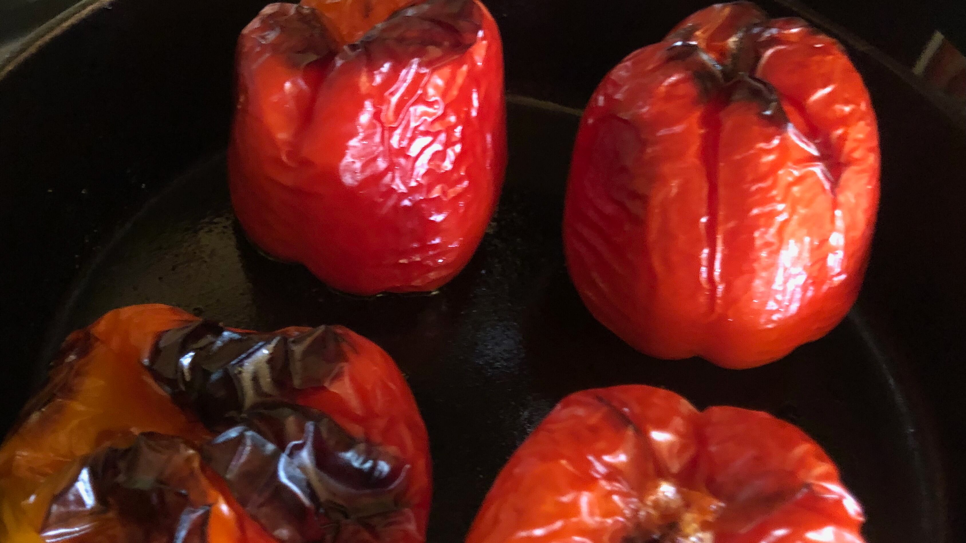 Arrange the peppers stem end down in the skillet so they don’t touch. Roast at 400 degrees for about an hour. The skins will look brown and a little dry, but they won’t be blackened like they get with more direct heat. Remove from the oven and let cool.