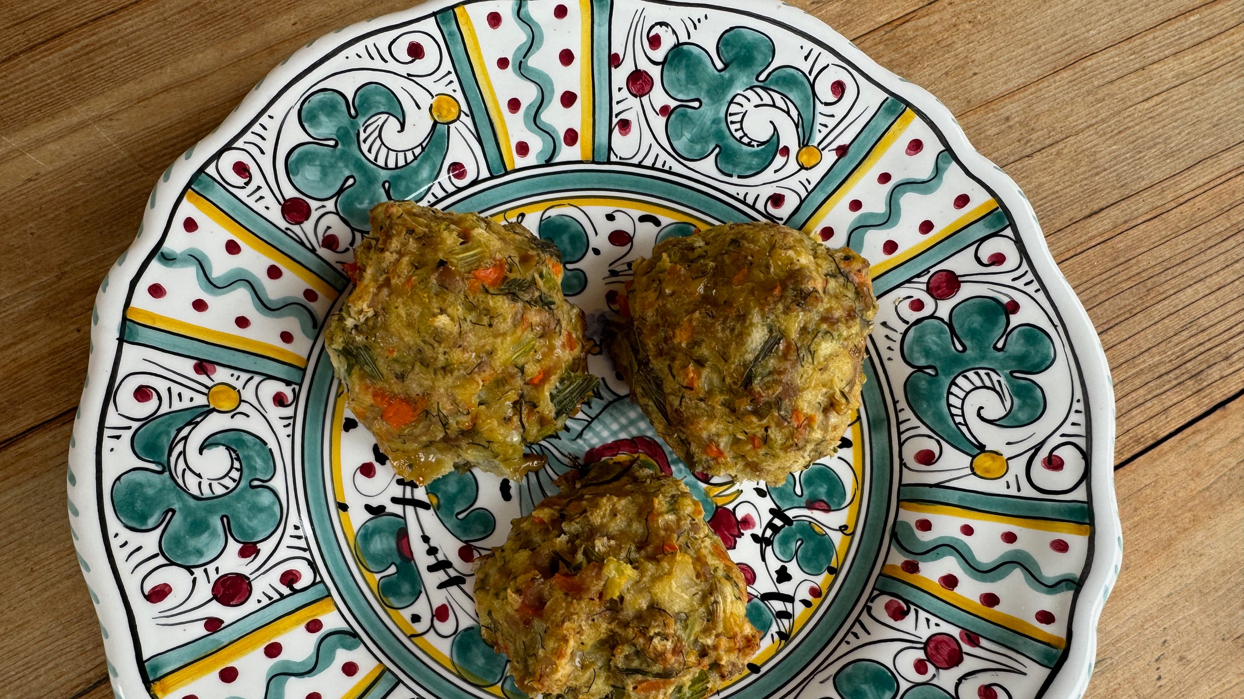 I make meatballs the same way I make meatloaf, roughly equal amounts by volume of ground meat and vegetables. Other recipes may add a little onion or garlic for flavor, or sometimes a bit of mashed potato to hold them together, but they’re still mostly meat so they tend to be a bit dense. More vegetables makes them lighter, and since vegetables are mostly water, cooking them drives some of it off and concentrates their flavor.