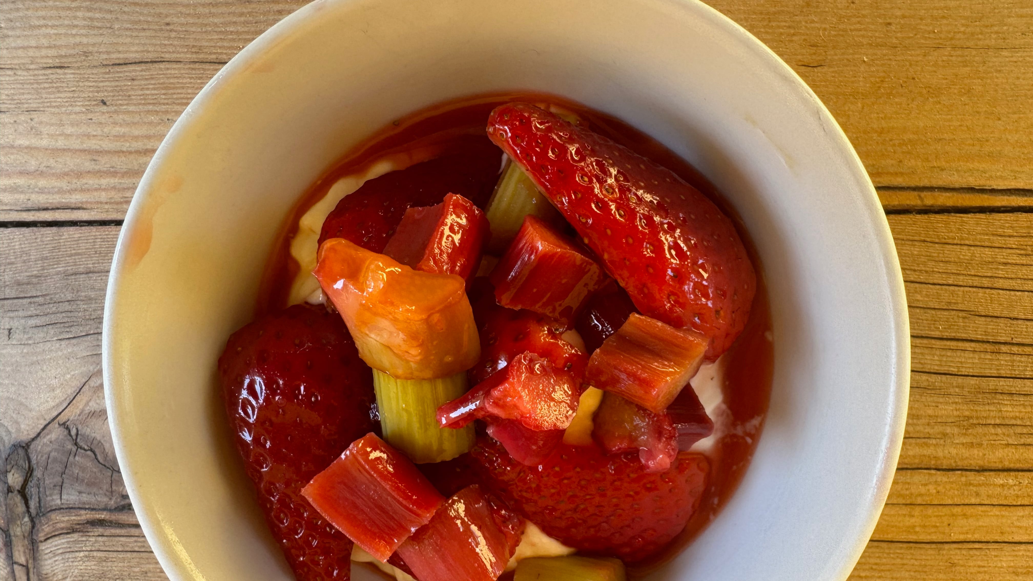 Use a slotted spoon to transfer the rhubarb to the bowl with the strawberries, then bring the cooking liquid to a boil and reduce the volume to about ¼ cup. Let it cool for a few minutes before pouring it over the fruit. Refrigerate before serving.