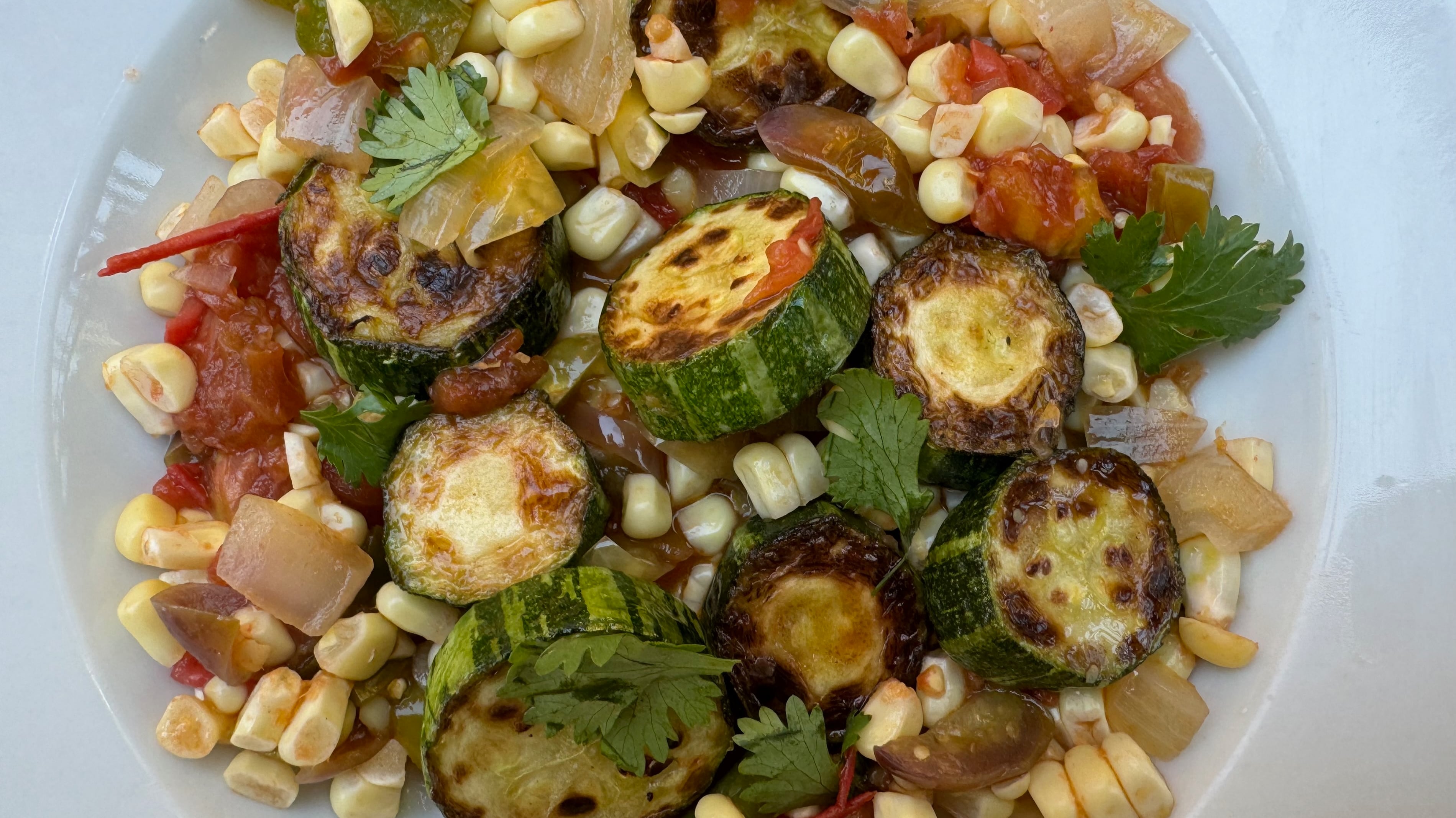 Calabaza means squash in Spanish, and just like how when Italians add “ini” to indicate something smaller, the diminutive suffix lets us know that calabacitas are, well, zucchini. Mexicans cook the little squash with corn and tomato as a side dish or meatless taco filling. Most of the ingredients are in the produce section all year, but this is really best with fresh corn.