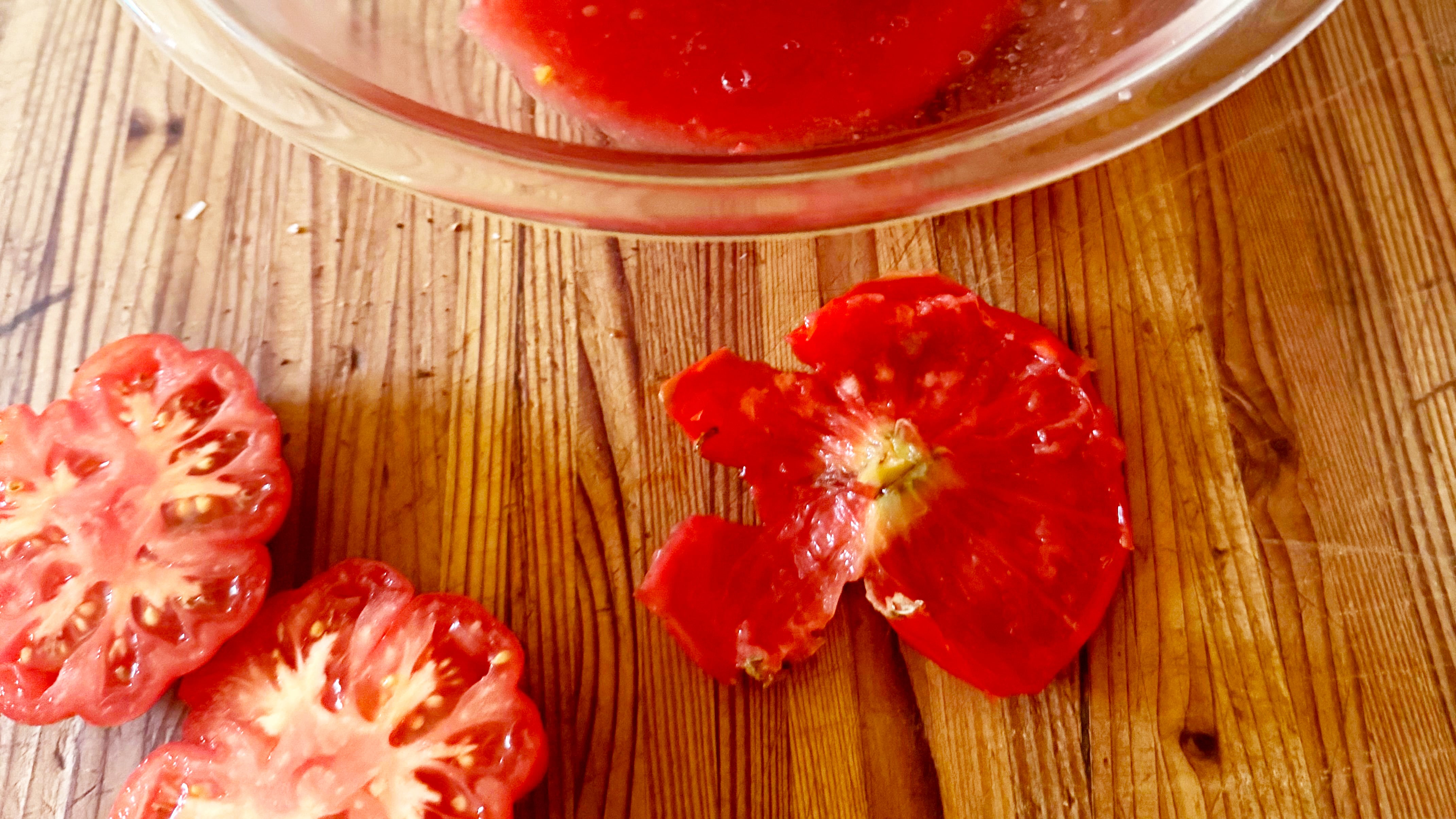 It works for all kinds of tomatoes, although I wouldn’t recommend grating cherry tomatoes. All you need is a grater with large holes and a bowl. Slice the tomato in half at the equator, place your grater in the bowl, and rub the cut side against the holes. Press gently with a flat hand and grate slowly until all that’s left is the skin, which you can salt and eat, toss in the compost, or dry and grind to make tomato powder. Use the grated tomato in cooked dishes where you want some extra umami flavor. Spoon it raw over yogurt or labneh to scoop up with bread or chips.