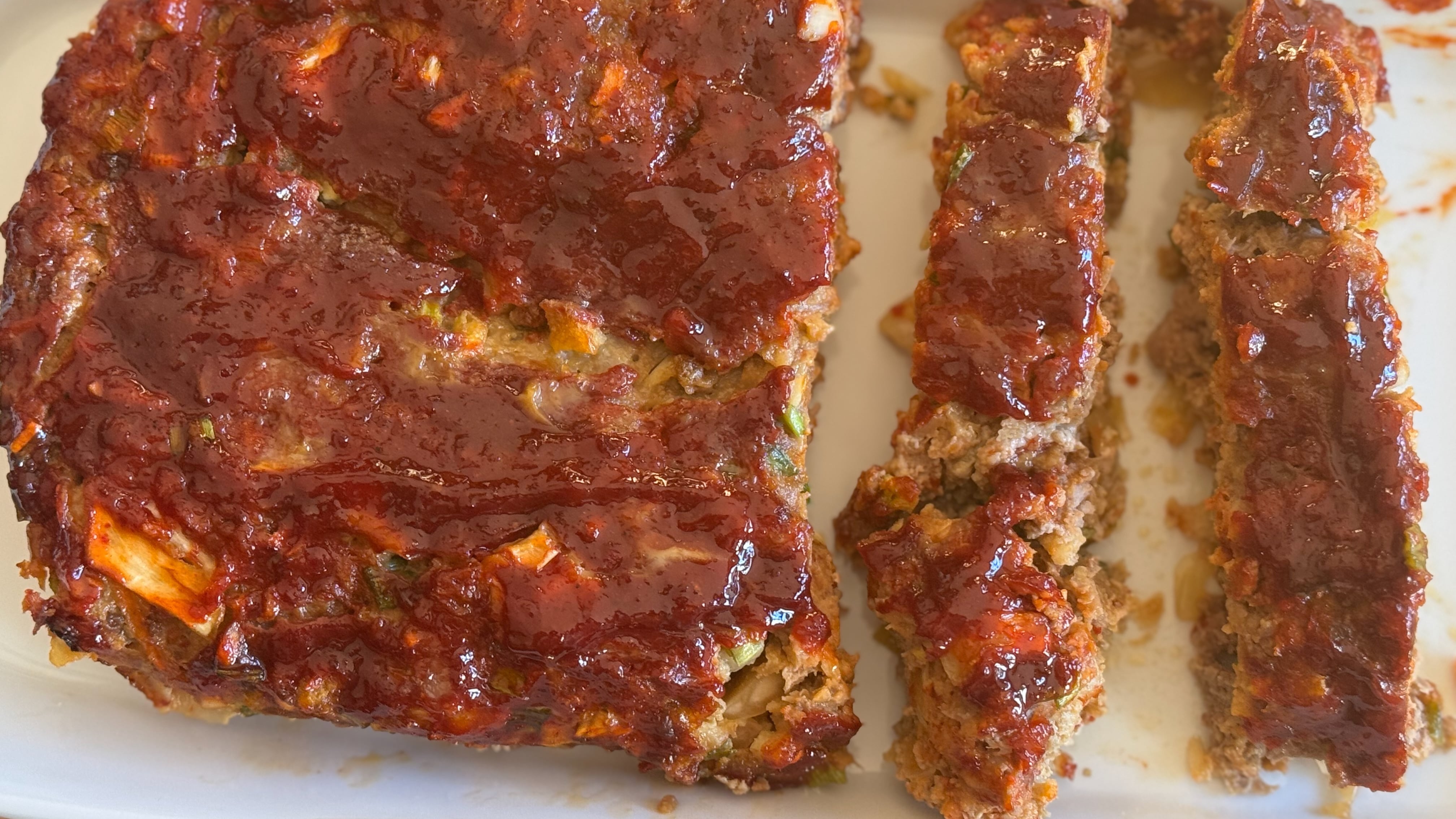 Mix everything except the ketchup and gochujang together in a large bowl. Transfer the mix to a 10-inch skillet and form it into a loaf shape down the center. Mix a quarter cup of ketchup and a quarter cup of gochujang together to make gochujang glaze, and spread it over the top and down the sides. Bake at 350 degrees for about 30 minutes, and let cool 15–20 minutes before slicing. You can pack it into a standard loaf pan for a thicker meatloaf, but bake it a bit longer, maybe 45 minutes.