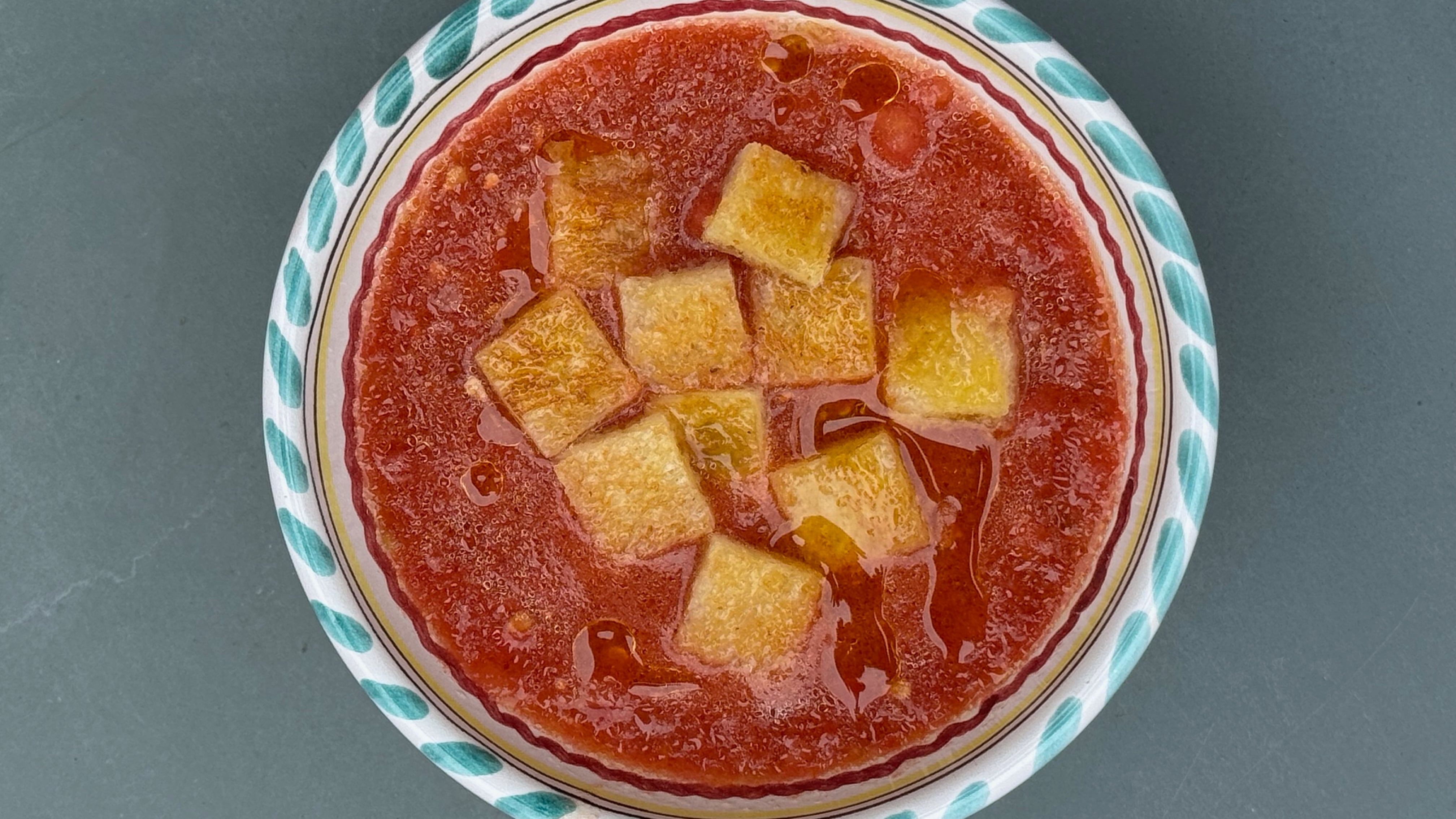 To serve, ladle the salmorejo into bowls, then add several croutons into each bowl and let them soak up the tomato broth for a few minutes. Drizzle a little more olive oil on top.