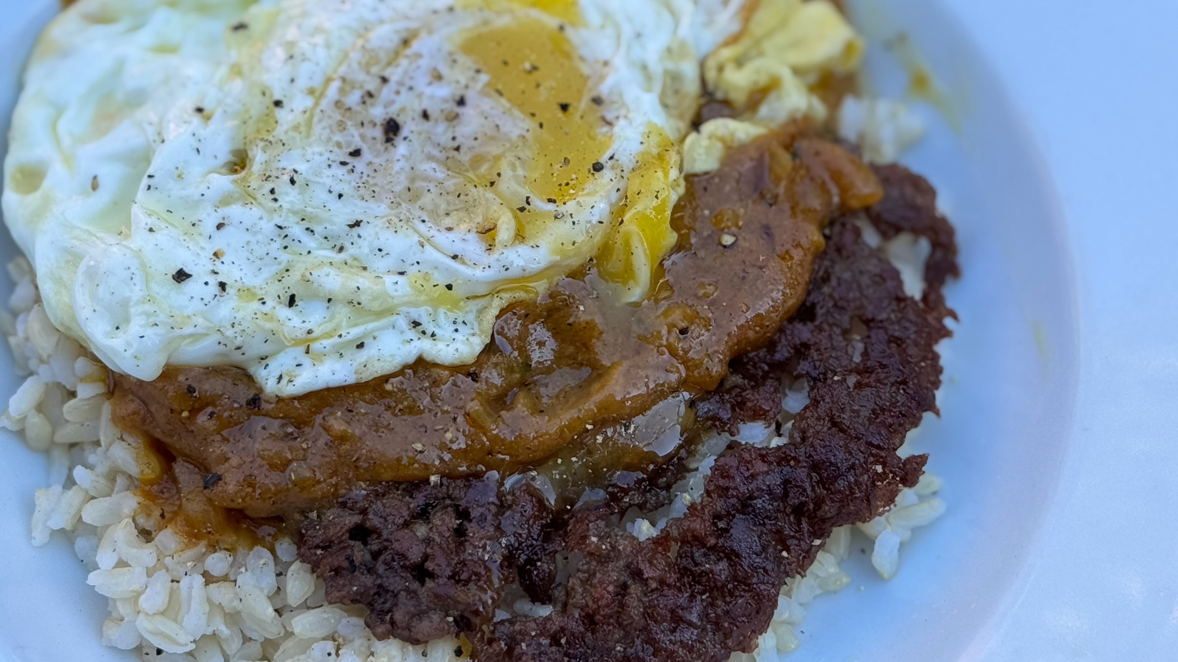 Assemble the loco moco with a generous scoop of rice with a smashburger on top, gravy next, and crown everything with the fried egg.