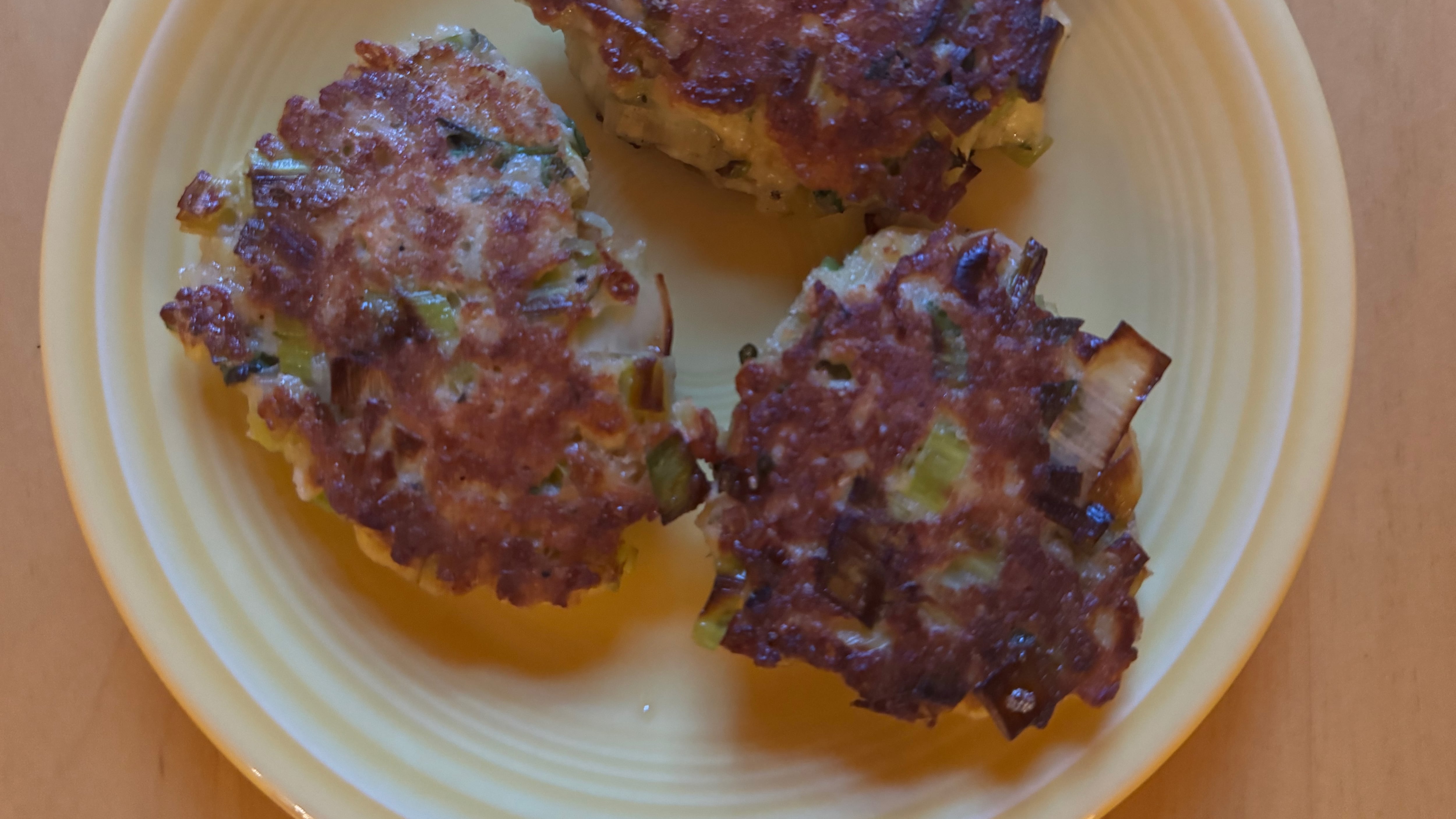 These fritters use the same ingredients but streamline the traditional approach, which calls for subjecting sausage-shaped fritters to a flour-egg-breadcrumb dip before deep frying. The sliced leeks get cooked in olive oil, then mixed with a few other ingredients. Caerphilly cheese sounds a lot like Mexican-style cotija cheese from Salem’s Don Froylan Creamery, and widely available Japanese-style panko makes a lighter fritter than the coarse breads of 19th century Wales.