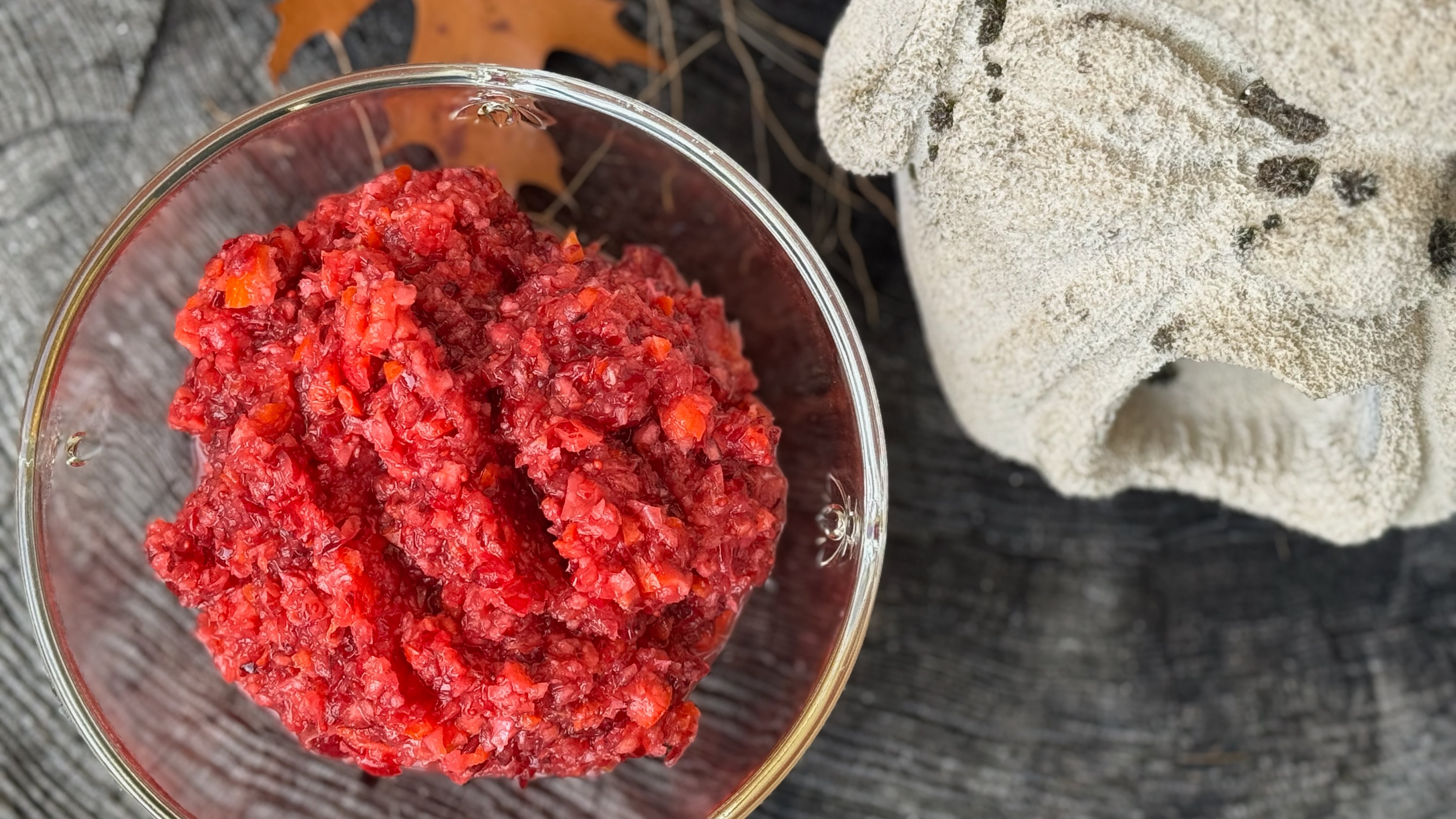 When I was growing up in Roseburg, my Thanksgiving job was cranking a meat grinder clamped to the kitchen counter to make cranberry-orange relish from the recipe on the back of the Ocean Spray bag. The deep red berries would pop as they were crushed against the grinding plate by the augur screw; the oranges, cut into wedges so they’d fit into the hopper, weren’t as noisy but produced lots of juice. I rolled dish towels into makeshift dams that channeled the growing lake of sticky drippings into a bowl on the floor.