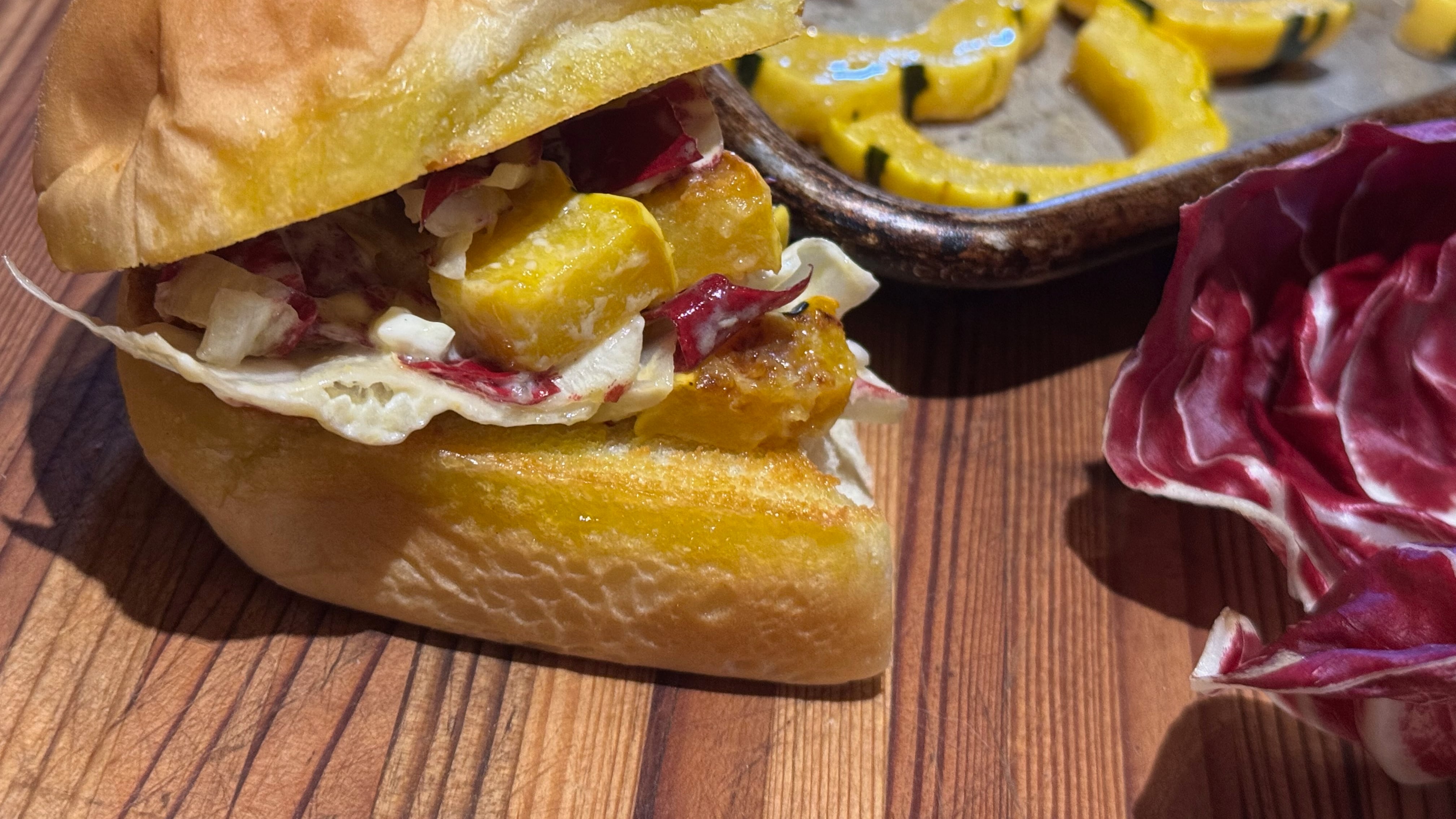 Cut the squash slices into cube-like pieces about ½ inch long. Combine them with the radicchio and dressing, then mound a couple of spoonfuls of the mix onto the bottom half of a grilled roll. Add the top, eat, and repeat.
