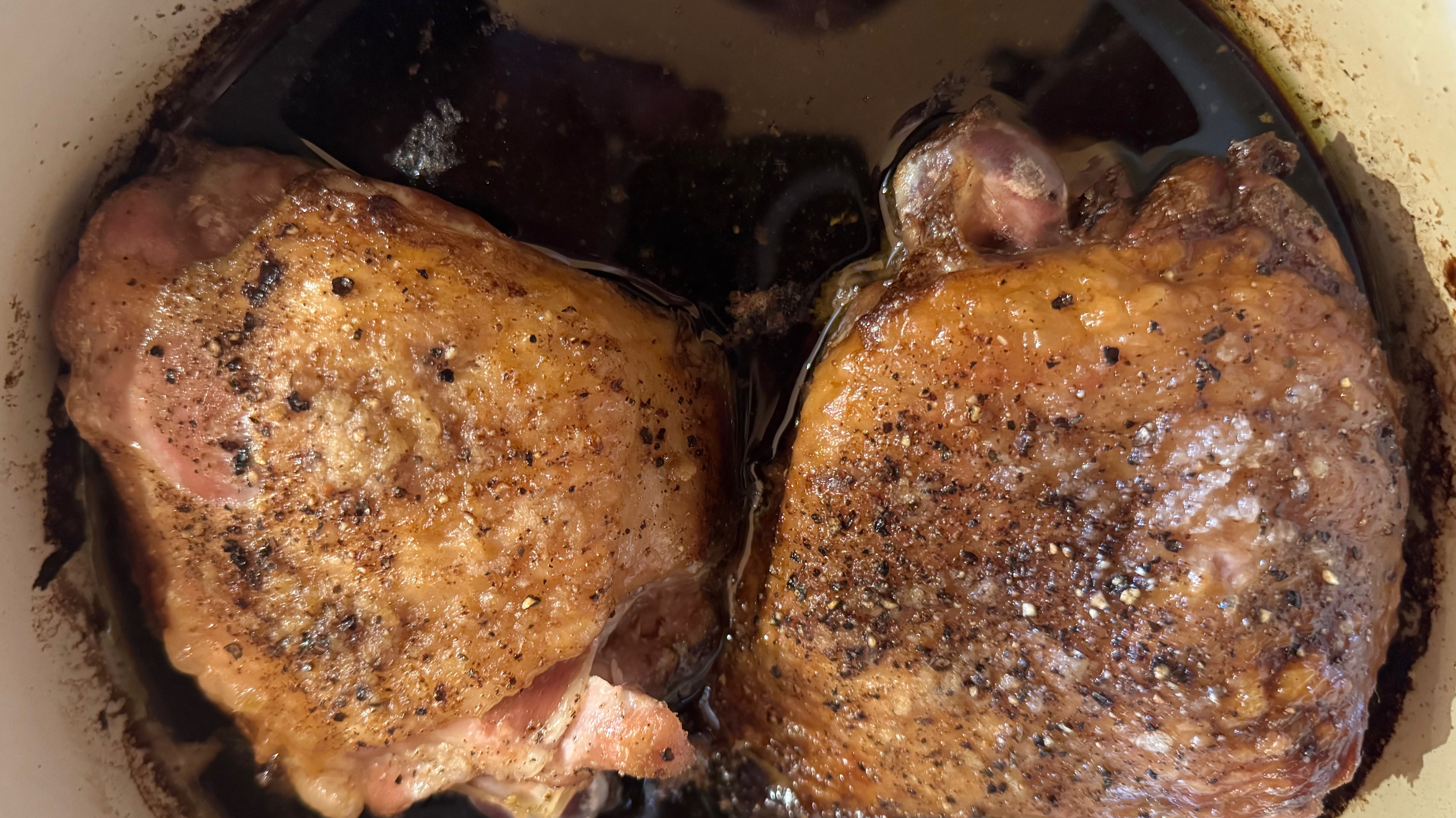 Cook uncovered in a 325°F oven for an hour, basting once or twice and adding a little more beer. While an internal temperature of 165°F means they’re done, I prefer to cook them to between 170 and 180. Thighs have more connective tissue, and it takes longer and a little more heat before its collagen softens to gelatin to create that fall-apart texture. If you don’t have a thermometer, stick the thighs with a fork to test them, but don’t let them cook too long or they’ll dry out.