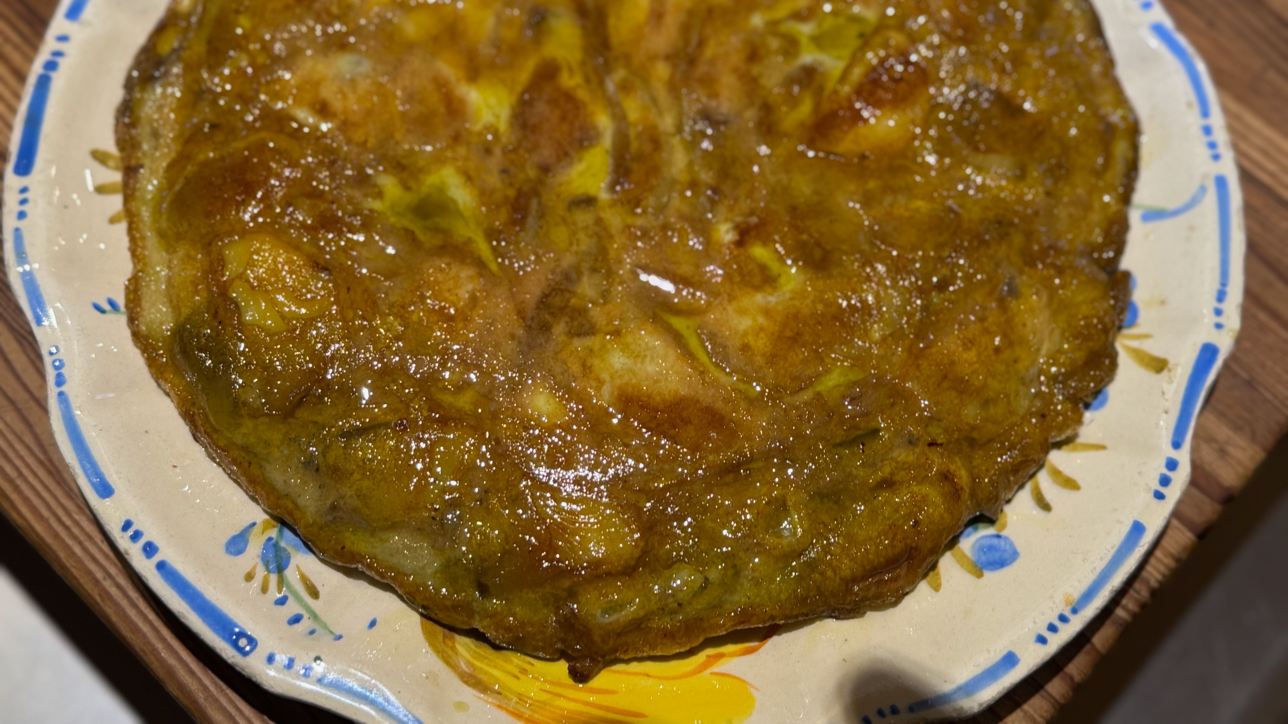 Anyway, once the bottom of the stovetop tortilla sets, the cook slides a plate over the runny-looking egg mix in the hot skillet and quickly flips it over, then slides the now-inverted tortilla back into the pan. Those who cook them often say this plate-flipping technique should really be done a few times since the point is getting the center done without overcooking the outside. While it usually goes well, the flip can be a little fraught for those who aren’t practised.