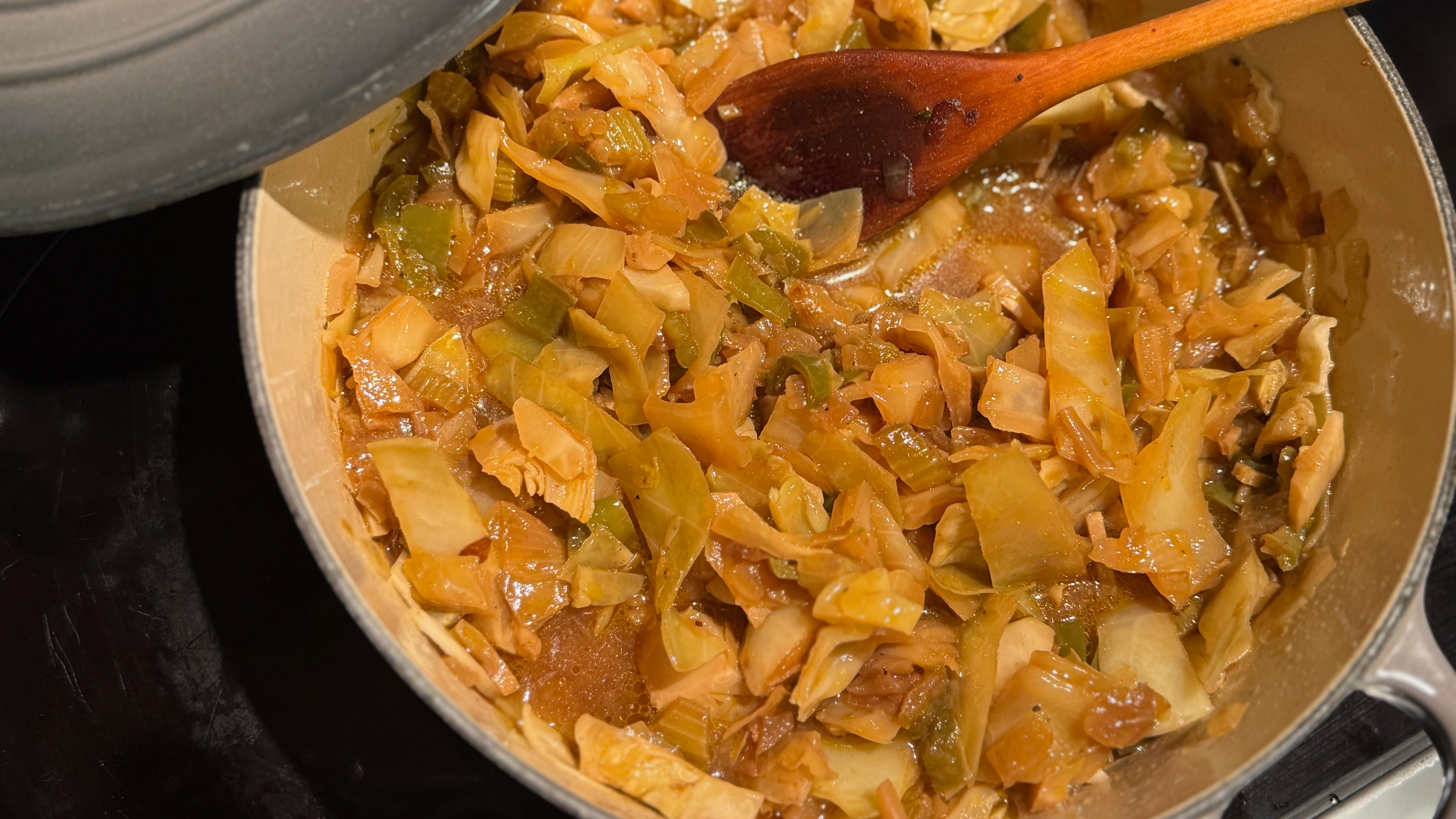 In a heavy pot with a lid, cook the onion in the olive oil over medium heat until it starts to brown, about 25 minutes. Add the pepper and celery and continue cooking until they are very soft and beginning to color, another 10-15 minutes. Add the cabbage, garlic, and seasonings; cook, stirring regularly, for another 15 minutes or until the cabbage begins to get soft.