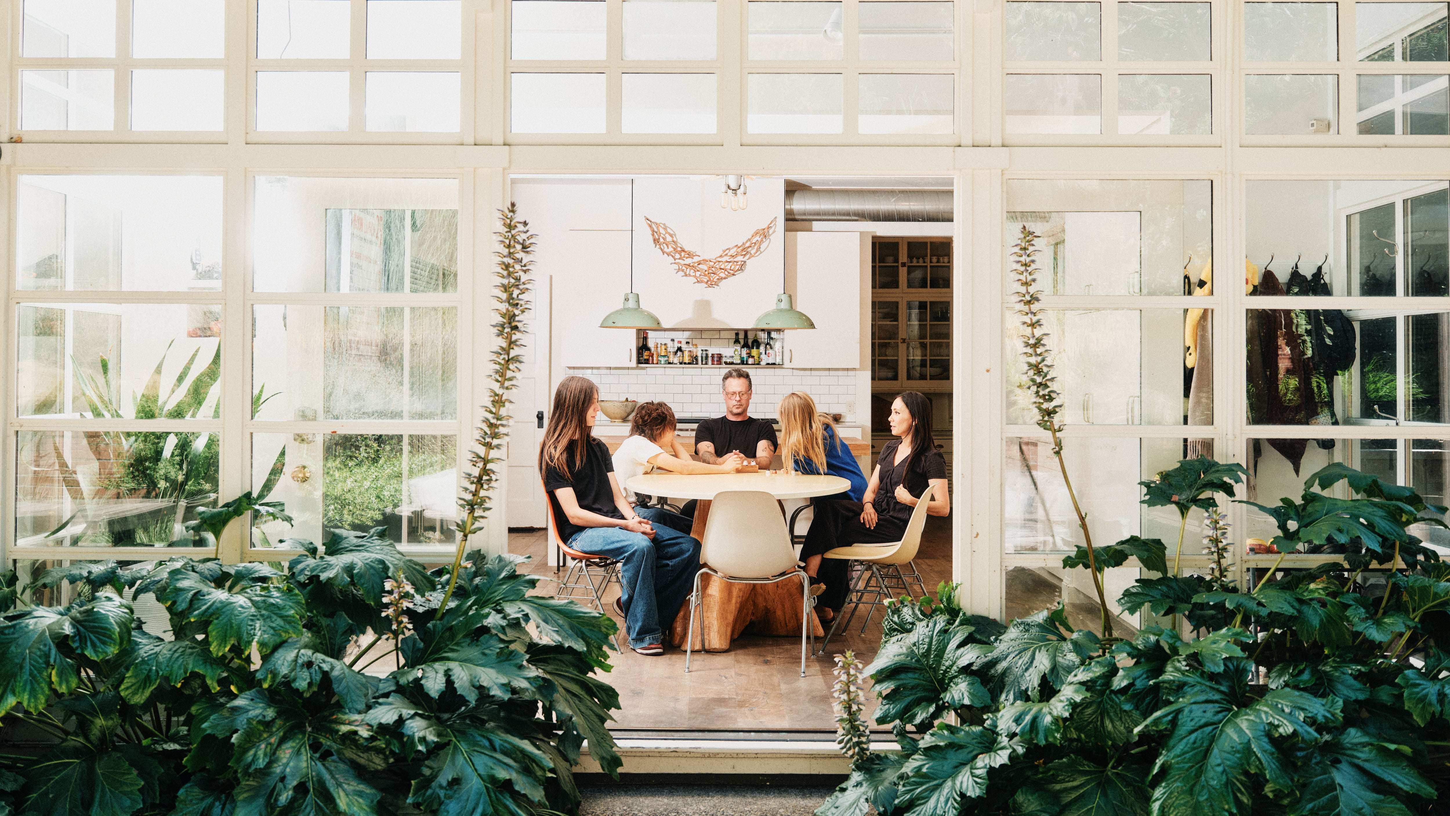 The shelves are just a small sliver of the 1908 home in Southwest Portland or, more accurately, the creative world inside the walls. These four floors—from the multicolored disco-lit basement with the half-pipe, to the wild unfurling ceramics on the walls, dried eucalyptus wreathed across the door frame, or the airy atrium overlooking the English-style garden—are eclectic and warm. But there’s also a hint of spontaneity, artistry teetering on randomness, in an alluring way. “It’s totally not thoughtful,” Gronquist says.