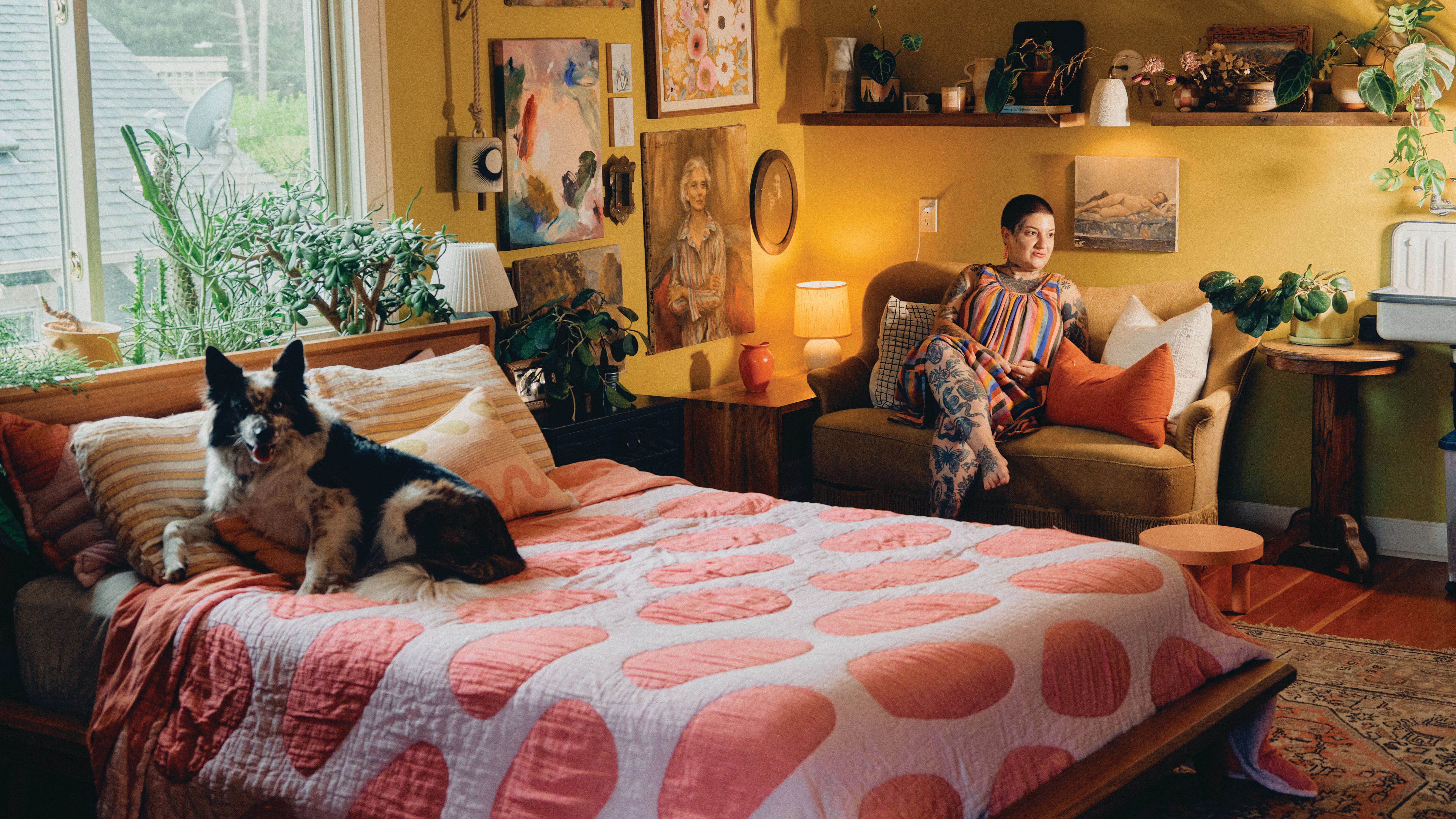 Three dogs—especially an Australian shepherd mix named Roo—bark and jump around to greet a visitor, while the six cats and three other humans (including her partner, Seth Solle) besides Goodfriend who live here make themselves scarce. Potted houseplants and original art, both big and small, squeeze into every available nook or overlap with each other.